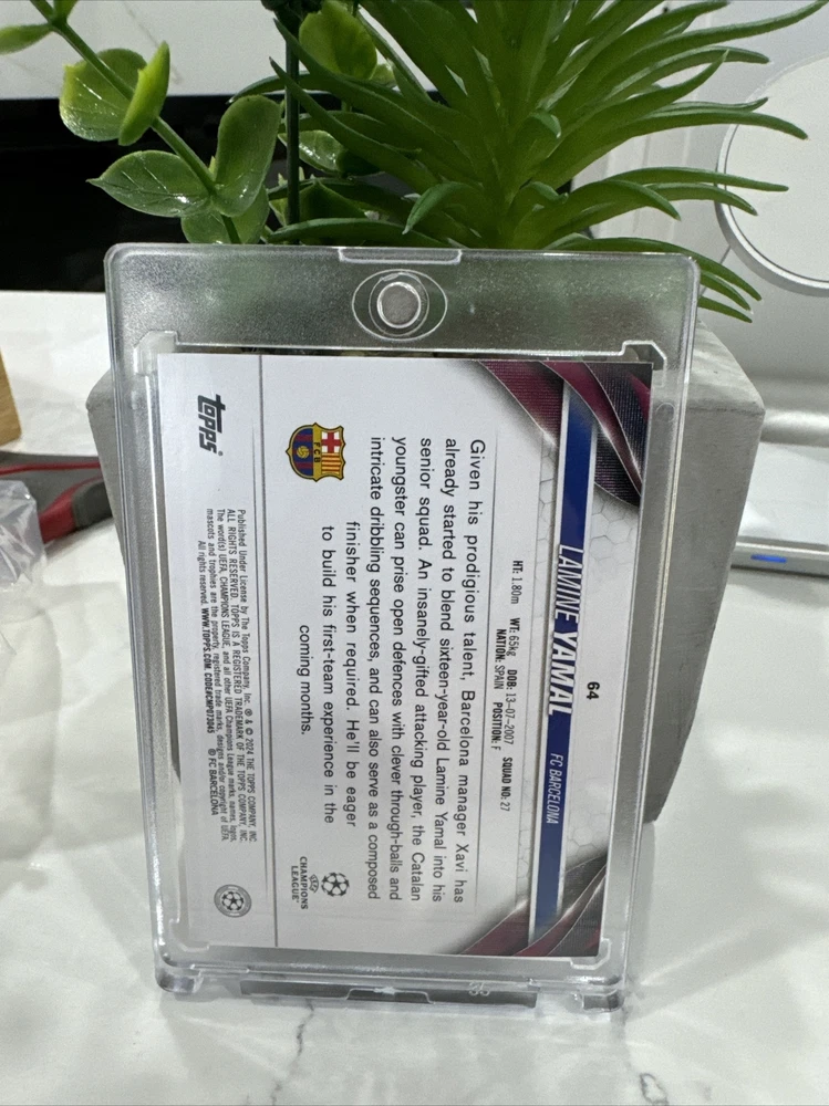 2023-24 Topps UEFA Club Jade Edition Lamine Yamal #64 Rookie RC Jade Foil trading card featuring the talented soccer player in his rookie season. This exclusive card from the prestigious UEFA Champions League set by Topps is a must-have for any sports trading card collector. The eye-catching foil design adds a special touch to this limited edition card, making it a valuable addition to any collection.