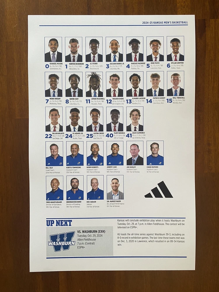 2024 #1 Kansas vs #16 Arkansas - Game Flipcard - NCAA College Basketball What a season this will be. Self vs Calipari! Date: October 25, 2024 Teams: Kansas vs Arkansas Size: 11”x17” media