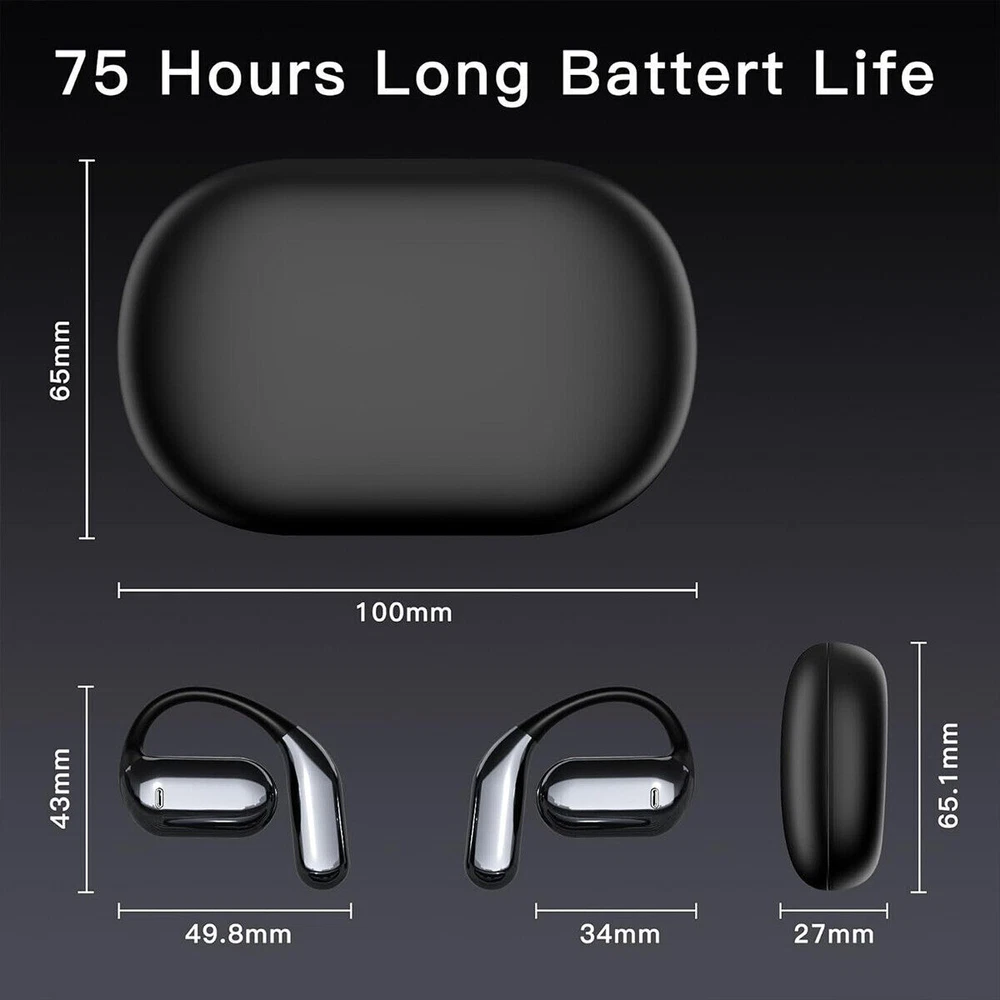 Features : Open Over Ear Design : Open Ear Bluetooth Headphones feature a revolutionary ergonomic design, allowing you to enjoy your favorite music while staying aware of the surrounding environment. With this innovatively designed sports open earbuds, you can hear external sounds clearly without compromising on comfort. The open bluetooth earphones has a unique shape, without being plugged into the ear canal, no longer pain your ear because of long time wearing. Bluetooth 5.4 Enhanced Connectivity : Experience faster and more stable transmission speeds with bluetooth 5.4 technology. Our wireless earphones offer seamless pairing and connection with your smart devices, ensuring high quality sound with ultra-low latency and perfect synchronization. Enjoy your music without any signal loss or interruptions. The bluetooth headphones are equipped with flexible touch control, enabling you to perform all functions with a gentle tap. 48H Playtime & LED Digital Display : Open ear bone conduction headphones have up to 150 hours of standby time , and 8 hours of continuous play time on a single charge. The included lightweight and compact magnetic charging case provides an additional 40 hours of playtime, ensuring you never run out of music. The case can be fully charged in just 1 hour via the fast charging Type-C cable (including). High Fidelity Clear Calls and Wide Compatibility : Equipped with advanced dual built-in microphones, over ear bluetooth earbuds provide crystal clear hands-free calls. Additionally, the speaker delivers powerful, high-quality sound for an immersive audio experience. The wireless headphones bluetooth can be effortlessly connected to nearly any Bluetooth-enabled audio device, providing you with the versatility to use various types of devices as needed. Lightweight and Secure Fit: Our open Ear Headphones are incredibly lightweight. Crafted from premium soft silicone material.With our original gravity balanced design, the over-ear earbuds evenly distribute their weight around your ears, reducing pressure on a single point. The multi-point support system evenly distributes the weight on your ears to prevent them from falling off, making them perfect for running, fitness activities, meetings, or outdoors. Specification: wireless version: V5.4 Talk time: 7-8 hours Music playing: 7-8 hours Standby time: 150 hours Communication distance:≥10m Charging time of headset: about 1.5hour Headset battery capacity: 60mAh Battery capacity of charging chamber: 500mAh Frequency range: 2.40ghz-2.48-ghz Support agreement:A2DP1.3/HFP1.6 / HSP1.2/AVRCP1.6/D11.3 Package Included: 2 x Wireless earphones 1 x Charging case 1 x USB-C charging cable 1 x Quick Start Guide