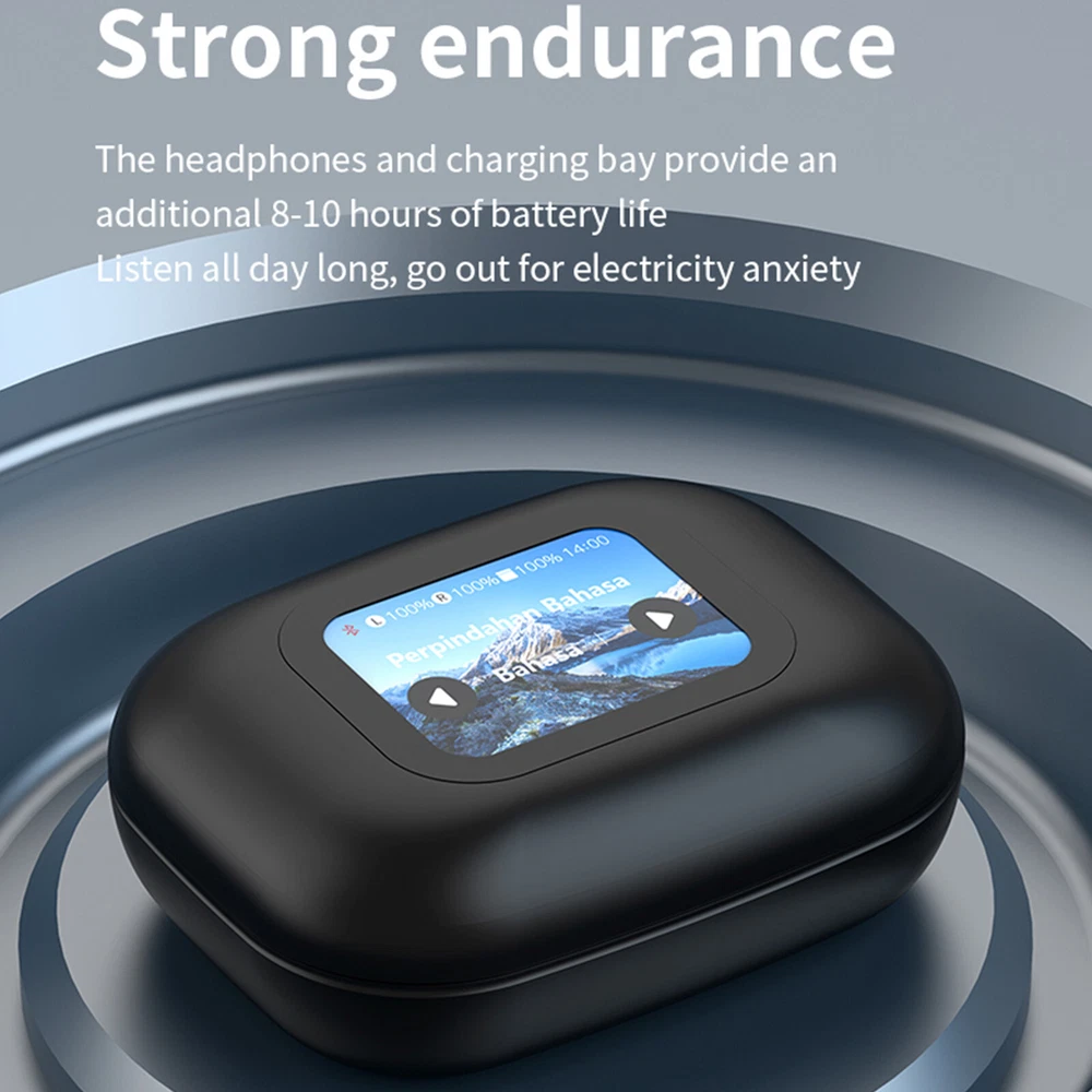2025 Bluetooth AI Translator Earbuds 144+ Language Real-Time Translate Earphones Product features: -LCD intelligent display screen, full touch screen operation control -High precision translation, the product supports intelligent translation of 144 international mainstream languages, and supports conference assistants and intelligent assistants. -Large capacity battery, capable of long-lasting endurance, with a single charge lasting over 8 hours -Equipped with the latest 5.4 version intelligent chip, it responds quickly and efficiently without any lag -The headphones are designed to fit the human body, providing comfortable wear without any fatigue -Adopting the latest pleasant speaker amplification, it feels like listening on site -The screen function supports switching between multiple international mainstream languages, making it more convenient to use. -There are multiple styles of wallpapers available for free selection -Electric warehouse supports TF card direct playback, instantly transforming into MP3 player -Screen control supports multiple atmosphere modes for playback Specification: Bluetooth version: 5.4 Transmission distance: 10 meters Material: PC+ABS Screen: LCD screen Battery capacity: 500mA Battery life: about 8 hours or more per use Charging time: about 1 hour Electric warehouse languages: about 20 TF card: Supports up to 32GB [not included] Input voltage: 5V2A Electric compartment interface: Type-C APP:AI COOL Translation languages: 144 Translation function: simultaneous interpreting/conference assistant/text translation Note: Product translation function, download the AI COOL app by scanning the QR code, and bind the AI translation app by scanning the QR code on the AI manual Support APP voice translation for 144 languages, conference assistant, intelligent assistant, etc Product List: Electric compartment+headphones * 1 Charging cable * 1 Instruction manual * 1 AI translation manual * 1