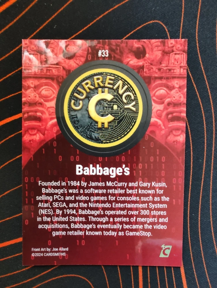 This is a NR-MT ungraded *HOLO FOIL* #33 BABBAGE'S to complete your Series 3 Cardsmiths Currency collection! All cards will be shipped within 48 hrs(usually within 24hrs) in a penny sleeve -> top loader -> zip lock -> envelope w/ Tracking Please let me know if you have any questions!