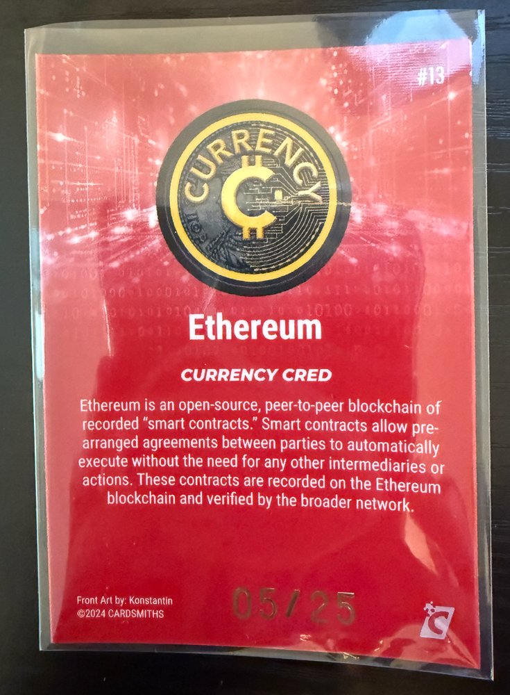 Own a piece of cryptocurrency history! This is a Ruby Gemstone Refractor™ edition of Ethereum #13 from the 2024 Cardsmiths Currency Series 4 set. This ultra-rare serial-numbered card is 05/25 , making it one of only 25 in existence. 💎 Card Details: Set: 2024 Cardsmiths Currency Series 4 Card Name: Ethereum #13 Parallel: Ruby Gemstone Refractor™ (Limited Print!) Serial Number: 05/25 (Low Numbered!) Condition: Near Mint / Mint – Pack Fresh, Sleeved & Top-Loaded 🚀 A Must-Have for Collectors & Investors! This card is perfect for cryptocurrency enthusiasts, investors, and trading card collectors looking to own a rare Ethereum-themed collectible .