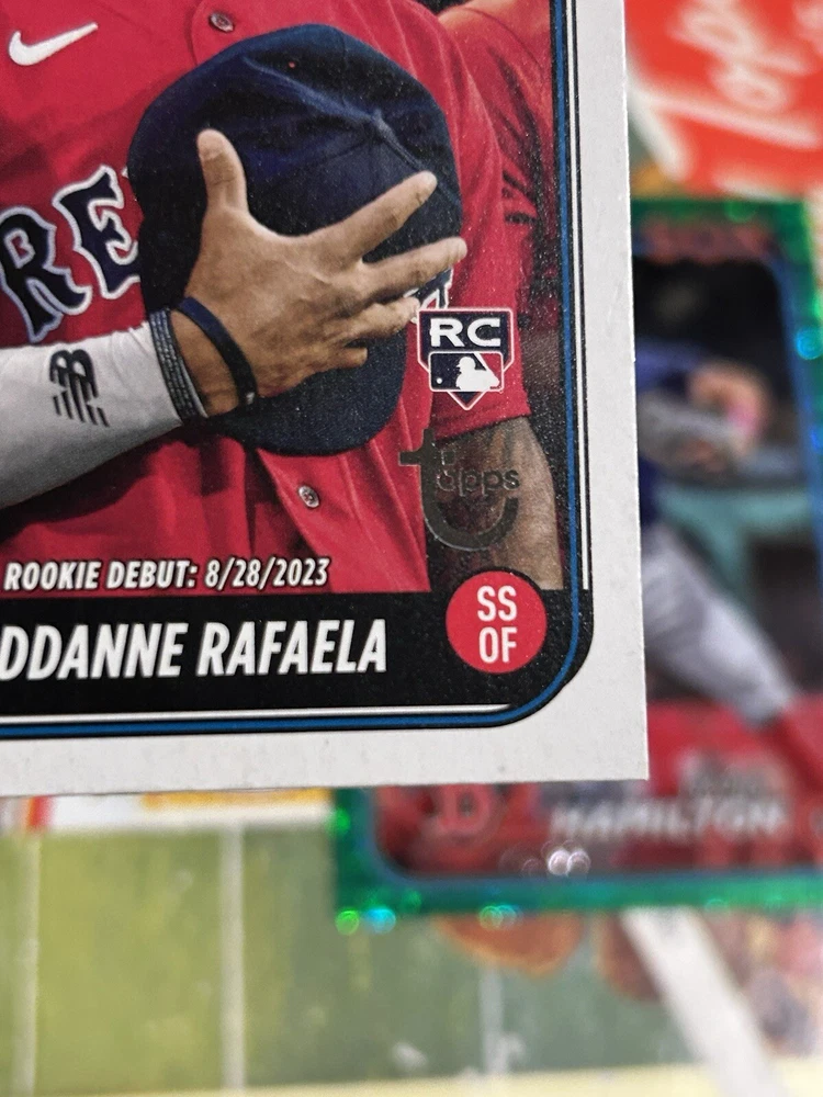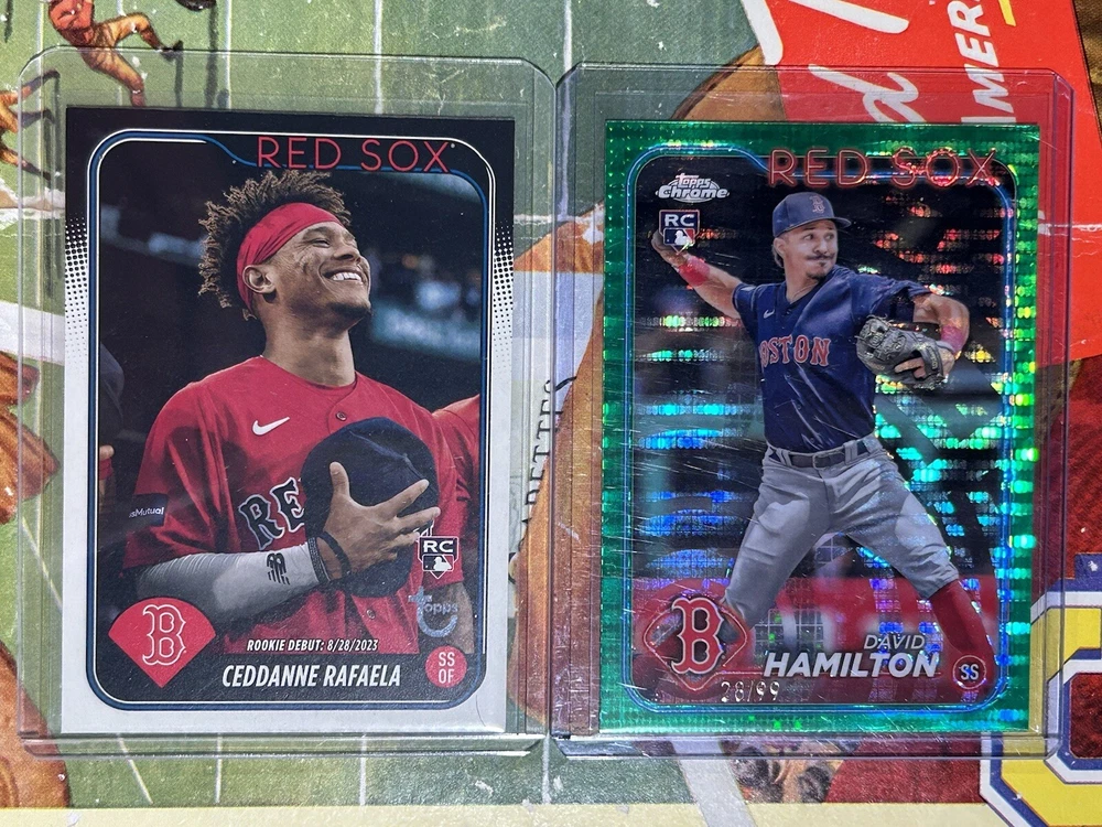 **** Also included is 2024 David Hamilton (RC): Topps Chrome- Green Sonar Refractor RC 28/99 #49. Thanks! **** This 2024 Topps Update Series sports trading card features Ceddanne Rafaela of the Boston Red Sox. The card is part of the Vintage Stock RC SP /99 parallel/variety and is serial numbered. It is a near mint or better conditioned card and is ungraded. The card is from the 2024 season and is a great addition to any baseball card collection. It is a base set rookie card and is manufactured by Topps. The card is perfect for fans of the Major League Baseball (MLB) and collectors alike.
