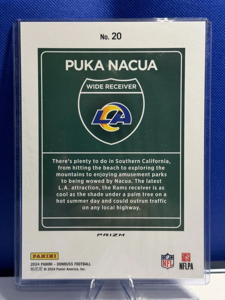 This is a rare and highly sought-after 2024 Donruss Puka Nacua Oversized Jumbo Prizm Oversize Downtown #20 trading card. It features a stunning design and showcases the talented Puka Nacua in his Los Angeles Rams uniform. The card is perfect for collectors and fans of the National Football League (NFL) and sports trading cards. With its oversized dimensions and Prizm parallel variety, this card is a true gem. It is manufactured by Panini and comes with Donruss autograph authentication. The card is a rookie card and features Puka Nacua's name, team, and card number. It is a must-have for any serious collector or fan of football.