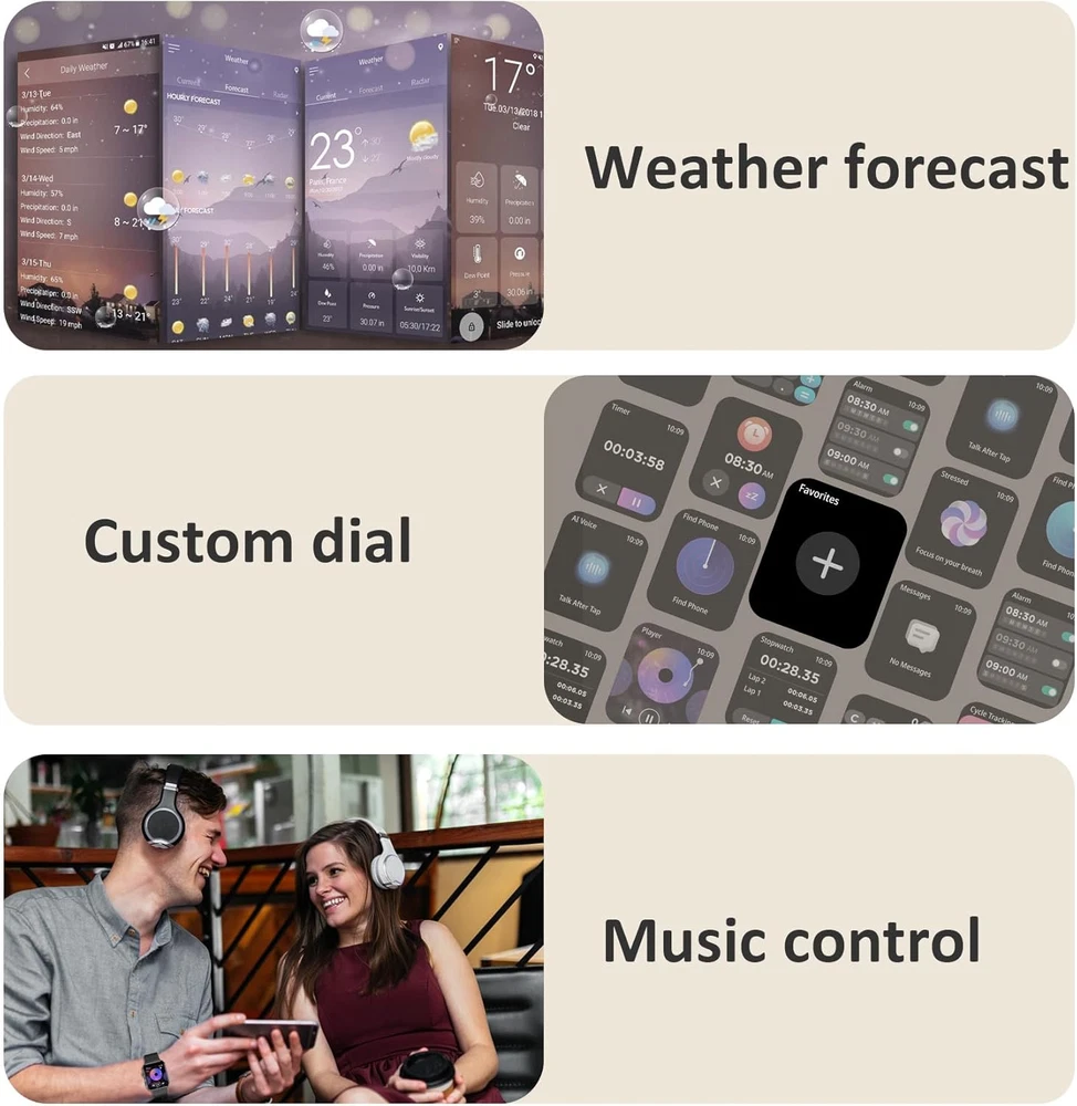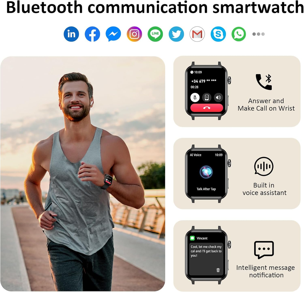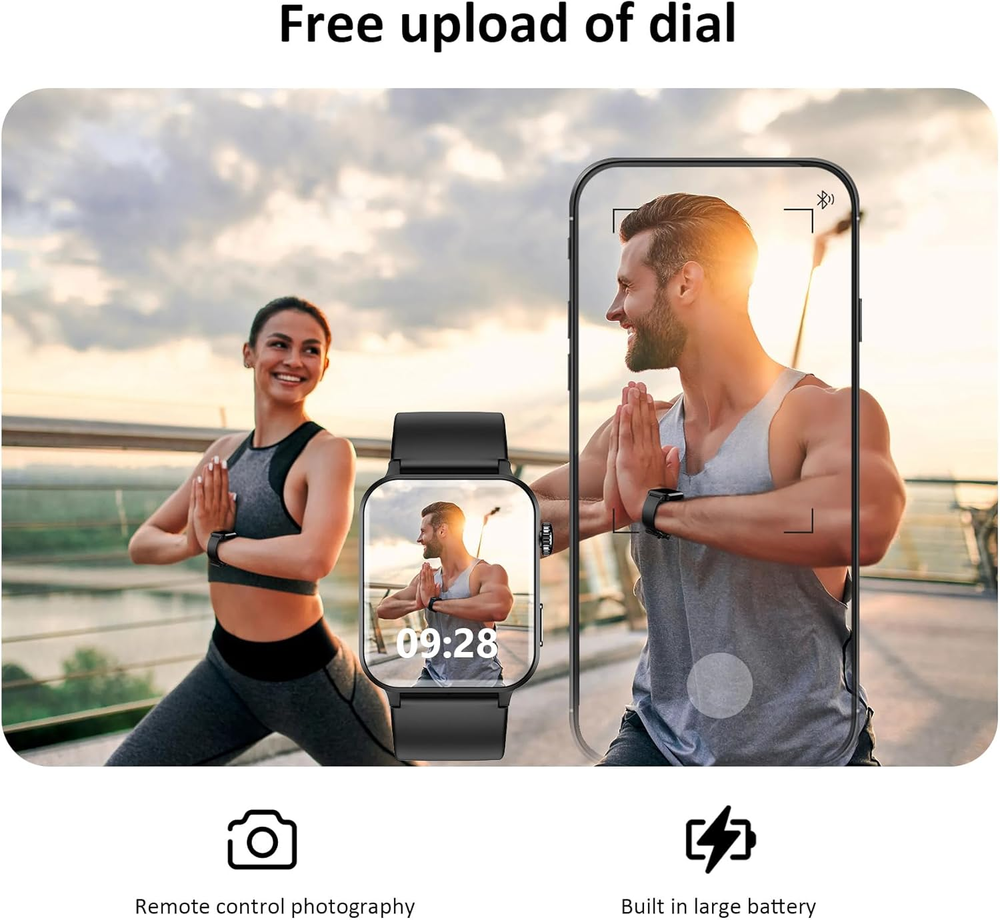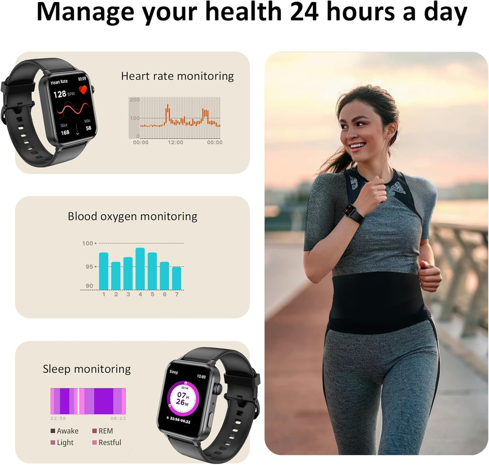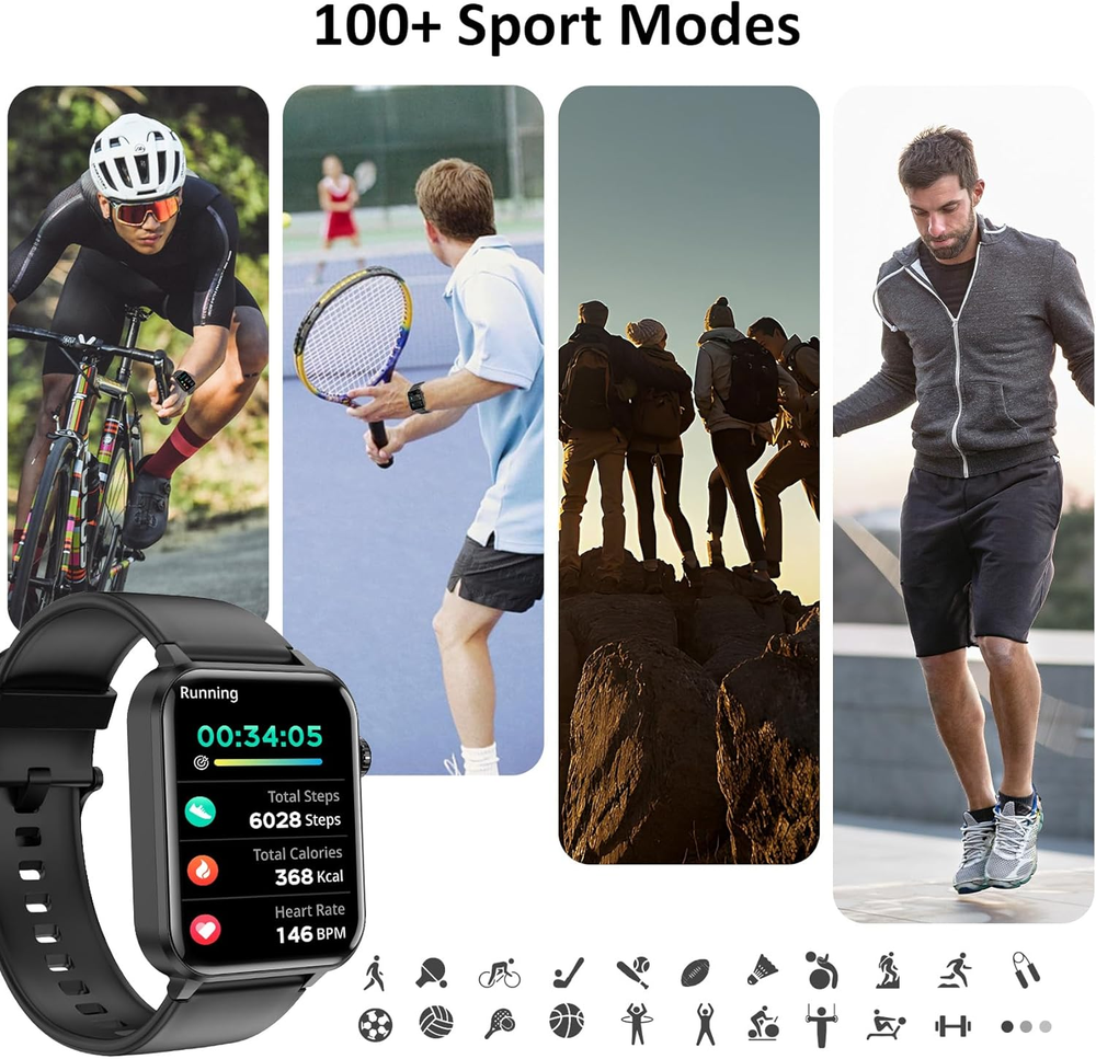 FREE FAST SHIPPING SATISFACTION GUARANTEED LIFETIME WARRANTY 24/7 CUSTOMER SERVICE Make & Answer Calls Anytime: Stay connected with Bluetooth calling—make and receive calls directly from your wrist. 24/7 Health Monitoring: Track your heart rate, SpO₂, sleep quality, steps, and calories burned in real-time. 100+ Sports Modes & IP68 Waterproof: Optimize your workouts with over 100 exercise modes and a water-resistant design for all-day wear. Lifetime Warranty: Invest with confidence—our lifetime warranty ensures long-lasting quality and peace of mind. Key Features: 1.85" HD Display: Enjoy a large, clear screen that makes navigating notifications, fitness stats, and calls easy. Comprehensive Health Tracking: Monitor heart rate, SpO₂, sleep patterns, and activity levels to stay on top of your wellness goals. Smart Notifications & Calls: Sync with your Android or iOS device to receive calls, messages, and alerts instantly. Durable & Stylish Design: A sleek, modern look with an IP68 waterproof rating—perfect for workouts and everyday use. 📌 Product Description: Take control of your health and fitness with our Fitness Tracker Watch with Heart Rate Monitor . Whether you’re hitting the gym, going for a run, or just staying active throughout the day, this tracker is your perfect companion. With 24/7 heart rate and sleep monitoring, you’ll gain valuable insights into your health. Stay motivated, set goals, and track your progress effortlessly! Upgrade your fitness journey today with a tracker designed for results.