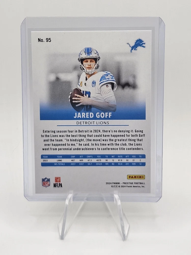 Capture a piece of football history with the 2024 Panini Prestige Green Premium Xtra Points card featuring Jared Goff. This limited edition collectible, card number 95, is a must-have for fans and collectors alike, highlighting the quarterback's tenure with the Los Angeles Rams, Detroit Lions, and California Golden Bears. With a print run of just 199, this serial-numbered gem is a unique addition to any collection. The card boasts an array of features including a hologram, base set inclusion, and insert, ensuring its standout presence. As part of the esteemed 2024 Panini Prestige set, it reflects the high-quality and intricate design that Panini is known for. Whether you're a die-hard NFL fan or a dedicated collector, this card is a noteworthy acquisition.