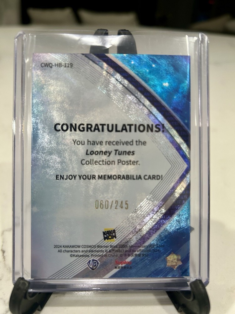 The 2024 Kakawow COSMOS Warner Bros Poster Booklet features Looney Tunes characters, specifically Bugs Bunny, and is numbered 060 out of 245. This non-sport trading card is part of the Warner Bros franchise and comes in a booklet format, making it a unique collectible item for fans of animated characters. Autographed status and grading information are not provided, but the card was manufactured in 2024, adding to its appeal for collectors interested in Warner Bros memorabilia.