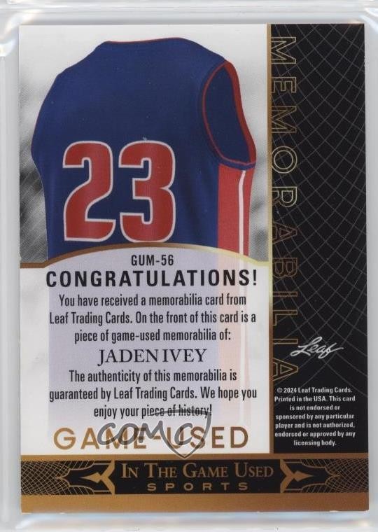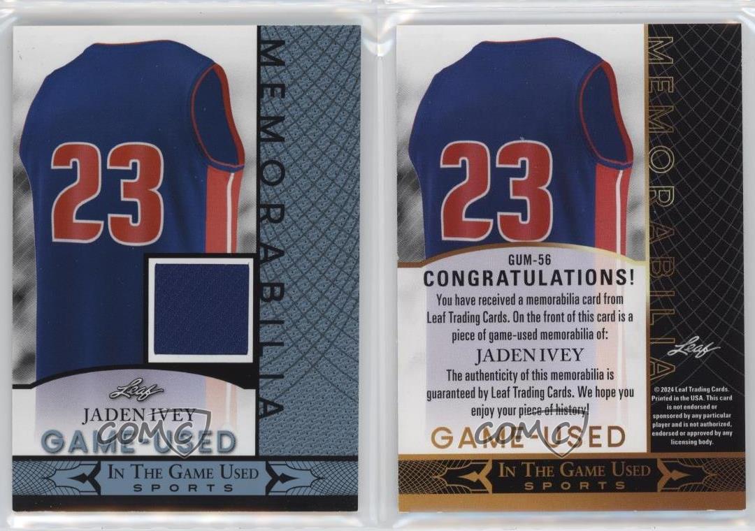 2024 Leaf In The Game Used Sports - Game Used Memorabilia Retail Mega Box - Platinum #GUM-56 Jaden Ivey - MultiSport Card - Featuring Jaden Ivey Search for more: 2024 Leaf In The Game Used Sports Search for more: 2024 Leaf In The Game Used Sports - Game Used Memorabilia Retail Mega Box - Platinum View all of our Listings Auctions Buy It Now About Us Located in the beautiful Pacific Northwest, COMC (Check Out My Cards) is the world's largest consignment service for trading card singles. More than 10,000 people have used our consignment service to list over 50 million trading cards. Find out how we can help you consign your items on eBay by contacting us through eBay messaging. COMC -- "The Safe & Easy Way to Buy & Sell" Representative Image - Select Specific Item above to see image of actual item Representative Image - Select Specific Item above to see image of actual item Raw Condition for Modern Cards Unless otherwise noted, raw modern cards are listed in Near Mint-Mint condition or better. A NM-MT card appears to be Mint at first glance, but upon closer inspection, may exhibit some of the following: minor print defects (e.g. roller marks, print line, dimple), minor scratches, slight edge wear, and slight corner wear. Centering is clearly visible in the images provided and does not factor into our condition assessment. Raw Condition for Vintage Cards Unless otherwise noted, raw vintage cards are listed in Excellent condition or better. An EX card may exhibit some of the following: minor rounding of corners, surface wear, print defects, light scratches, and slight edge wear/chipping. Centering is clearly visible in the images provided and does not factor into our condition assessment. Domestic Shipping Combined shipping for multiple items is available. To receive combined shipping, please ensure all desired items are in your eBay shopping cart before proceeding to checkout. eBay limits orders to 40 items per order. We automatically combine multiple orders placed on the same day. If you place multiple orders on the same day, please contact us to request a refund of applicable shipping costs. Signature confirmation may be required on invoices over $400. All cards are protected and shipped securely. International Shipping COMC offers eBay's International Shipping (EIS) for international orders under $2,500* (see country exceptions below). All duties and import fees are paid at checkout; in the rare event that there are additional import fees upon delivery, these are borne by the buyer. EIS packages route through a shipping hub in Erlanger, KY before shipping to their final destination. Please note that EIS does not allow for combined shipments. The shipping rates are determined by eBay and cannot be adjusted. *Maximum sale price exceptions: Colombia, Kuwait ($2,000); Taiwan ($1,539); Chile, Costa Rica, Guatemala, Honduras, Trinidad and Tobago ($1,000); Antigua and Barbuda, Aruba, Belize, Dominica, Grenada, Philippines, Saint Kitts and Nevis, Saint Lucia, Montserrat, Turks and Caicos Islands ($500); Dominican Republic, El Salvador ($200). Please request a shipping quote through eBay messaging for orders that exceed the maximum sale price supported by eBay's International Shipping. You will be responsible for all duties and import fees for international orders shipped outside the EIS. All cards are protected and shipped securely. Payment COMC does not accept offers on our cards through our eBay storefront. COMC utilizes eBay’s managed payments system. If you are experiencing difficulties making a payment, please contact eBay for assistance. Return Policy Returns are only accepted on the rare occasion the item is not as described. If you are making a return, please initiate the return process through eBay so a mailing label can be provided for you. Prior to listing, our expert team carefully assessed this item to represent it accurately. Please review the description and high-definition images prior to purchasing to ensure this item meets your satisfaction. We welcome you to contact us if you have further questions about this item. Trust and Integrity COMC carefully assesses each item consigned to us to prevent fraudulent items from entering the marketplace. If you believe an item offered on COMC may be fraudulent, please contact us with details so we can investigate the issue. Items we determine are outside our supported items policy may be removed. Last Modified: 11/20/2025 11:43:46 PM PDT