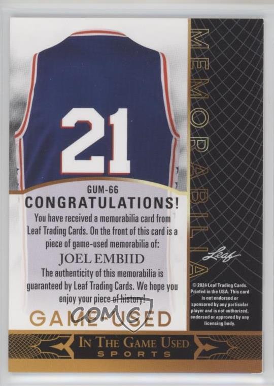2024 Leaf In The Game Used Sports - Game Used Memorabilia Retail Mega Box - Silver #GUM-66 Joel Embiid - MultiSport Card - Featuring Joel Embiid Search for more: 2024 Leaf In The Game Used Sports Search for more: 2024 Leaf In The Game Used Sports - Game Used Memorabilia Retail Mega Box - Silver View all of our Listings Auctions Buy It Now About Us Located in the beautiful Pacific Northwest, COMC (Check Out My Cards) is the world's largest consignment service for trading card singles. More than 10,000 people have used our consignment service to list over 50 million trading cards. Find out how we can help you consign your items on eBay by contacting us through eBay messaging. COMC -- "The Safe & Easy Way to Buy & Sell" Representative Image - Select Specific Item above to see image of actual item Representative Image - Select Specific Item above to see image of actual item Raw Condition for Modern Cards Unless otherwise noted, raw modern cards are listed in Near Mint-Mint condition or better. A NM-MT card appears to be Mint at first glance, but upon closer inspection, may exhibit some of the following: minor print defects (e.g. roller marks, print line, dimple), minor scratches, slight edge wear, and slight corner wear. Centering is clearly visible in the images provided and does not factor into our condition assessment. Raw Condition for Vintage Cards Unless otherwise noted, raw vintage cards are listed in Excellent condition or better. An EX card may exhibit some of the following: minor rounding of corners, surface wear, print defects, light scratches, and slight edge wear/chipping. Centering is clearly visible in the images provided and does not factor into our condition assessment. Domestic Shipping Combined shipping for multiple items is available. To receive combined shipping, please ensure all desired items are in your eBay shopping cart before proceeding to checkout. eBay limits orders to 40 items per order. We automatically combine multiple orders placed on the same day. If you place multiple orders on the same day, please contact us to request a refund of applicable shipping costs. Signature confirmation may be required on invoices over $400. All cards are protected and shipped securely. International Shipping COMC offers eBay's International Shipping (EIS) for international orders under $2,500* (see country exceptions below). All duties and import fees are paid at checkout; in the rare event that there are additional import fees upon delivery, these are borne by the buyer. EIS packages route through a shipping hub in Erlanger, KY before shipping to their final destination. Please note that EIS does not allow for combined shipments. The shipping rates are determined by eBay and cannot be adjusted. *Maximum sale price exceptions: Colombia, Kuwait ($2,000); Taiwan ($1,539); Chile, Costa Rica, Guatemala, Honduras, Trinidad and Tobago ($1,000); Antigua and Barbuda, Aruba, Belize, Dominica, Grenada, Philippines, Saint Kitts and Nevis, Saint Lucia, Montserrat, Turks and Caicos Islands ($500); Dominican Republic, El Salvador ($200). Please request a shipping quote through eBay messaging for orders that exceed the maximum sale price supported by eBay's International Shipping. You will be responsible for all duties and import fees for international orders shipped outside the EIS. All cards are protected and shipped securely. Payment COMC does not accept offers on our cards through our eBay storefront. COMC utilizes eBay’s managed payments system. If you are experiencing difficulties making a payment, please contact eBay for assistance. Return Policy Returns are only accepted on the rare occasion the item is not as described. If you are making a return, please initiate the return process through eBay so a mailing label can be provided for you. Prior to listing, our expert team carefully assessed this item to represent it accurately. Please review the description and high-definition images prior to purchasing to ensure this item meets your satisfaction. We welcome you to contact us if you have further questions about this item. Trust and Integrity COMC carefully assesses each item consigned to us to prevent fraudulent items from entering the marketplace. If you believe an item offered on COMC may be fraudulent, please contact us with details so we can investigate the issue. Items we determine are outside our supported items policy may be removed. Last Modified: 11/20/2025 11:00:11 PM PDT