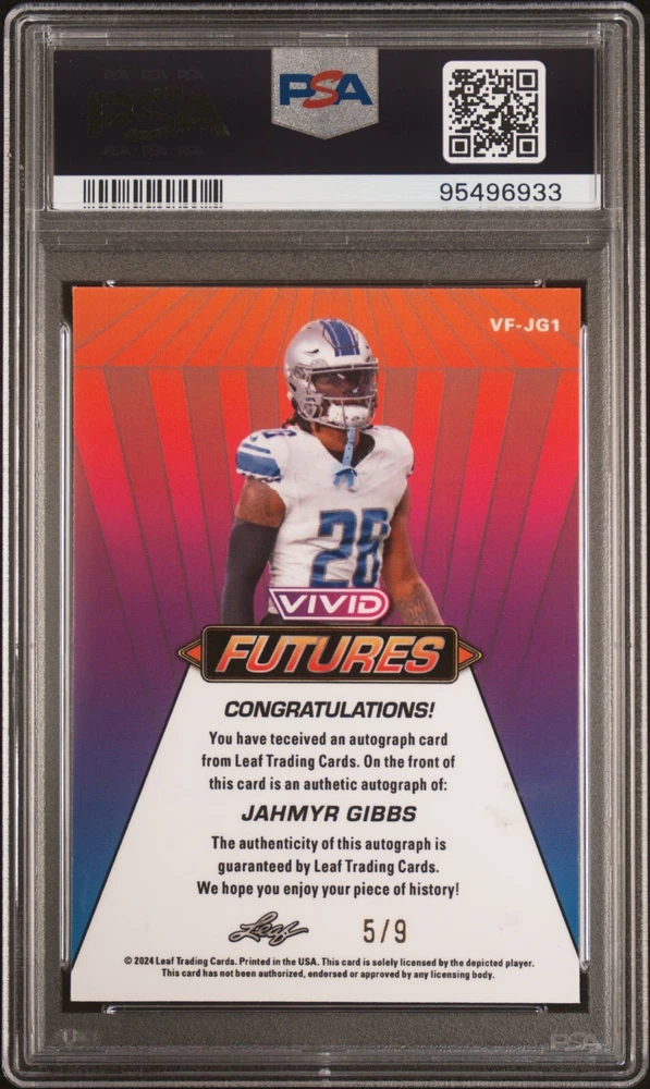 2024 Leaf Vivid Football Jahmyr Gibbs Gray Futures Mojo Auto 5/9 PSA 8 Auto 10