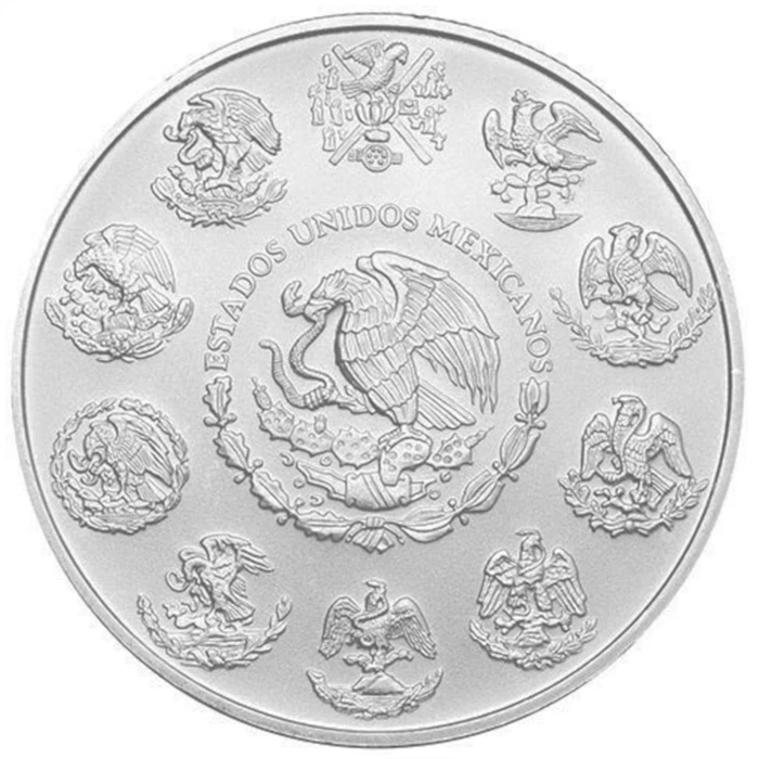 Mint: Banco de Mexico Quality: BU Alloy: 99.9% Fine Silver Diameter: 65 mm = 2.56 in Weight: 155.5 g = 5 oz Maximum Mintage: Max 28,200 pcs. Box/Capsule: No/No Certificate: No Libertad coins are Mexico’s official silver bullion coins and have obtained world renown for their design. Unlike most other countries’ official bullion coins, the Mexican Libertads do not have a face value. The reverse shows the winged Victoria, the symbol of Mexican independence, sometimes also called the Angel of Independence, standing in front of two volcanoes, Popocatépetl and Iztaccihuatl. The obverse features a relief design of the Mexican National Shield, surrounded by the legend "Estados Unidos Mexicanos" (United Mexican States).