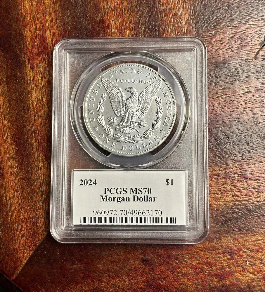 Country/Region of Manufacture: United States Year: 2024 Coin: Morgan Strike Type: Business Certification: PCGS Brand: UNITED STATES Shape: Coin Grade: MS 70 Precious Metal Content per Unit: 1 oz Brand/Mint: U.S. Mint Modified Item: No Composition: Silver Total Precious Metal Content: 0.859 OZ Fineness: 99.9