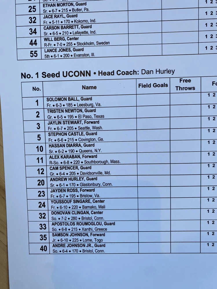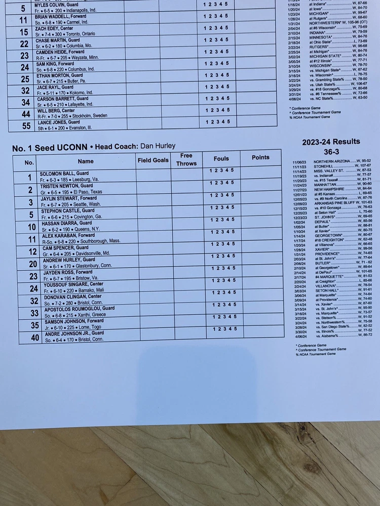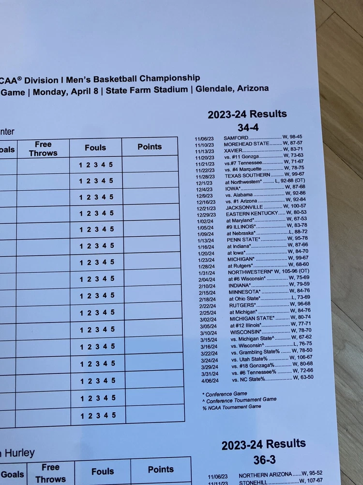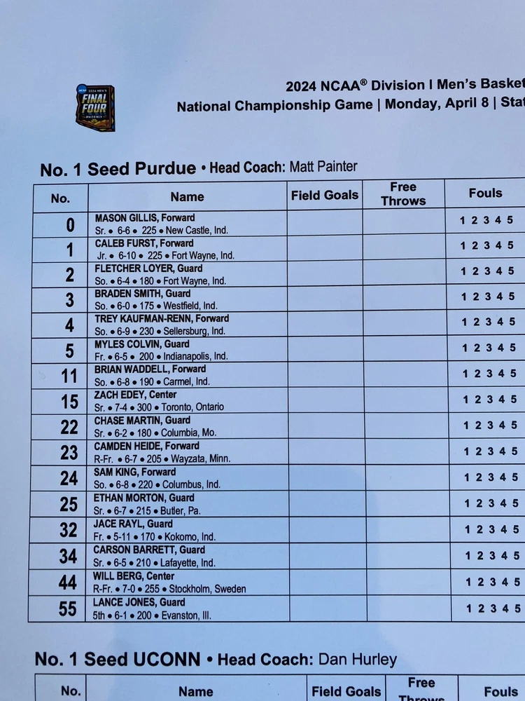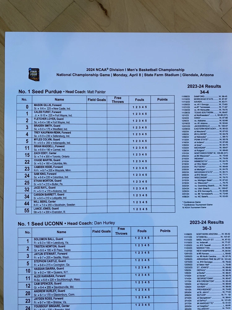 2024 NCAA Championship game!! UCONN vs PURDUE. History. Game Issued scorers scorecard scoresheet. Date: April 8, 2024 Team: UConn vs Purdue From: State Farm Stadium, Scottsdale, Arizona Sizes: 11”x17” lineup card