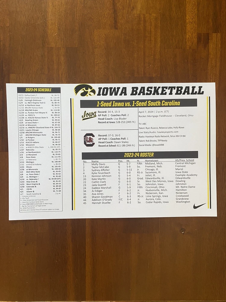 2024 Women’s College Basketball National Championship Iowa Game Flipcard. Caitlin Clark’s last college game!! Date: April 7, 2024 Teams: Iowa vs South Carolina Size: 11”x17” media