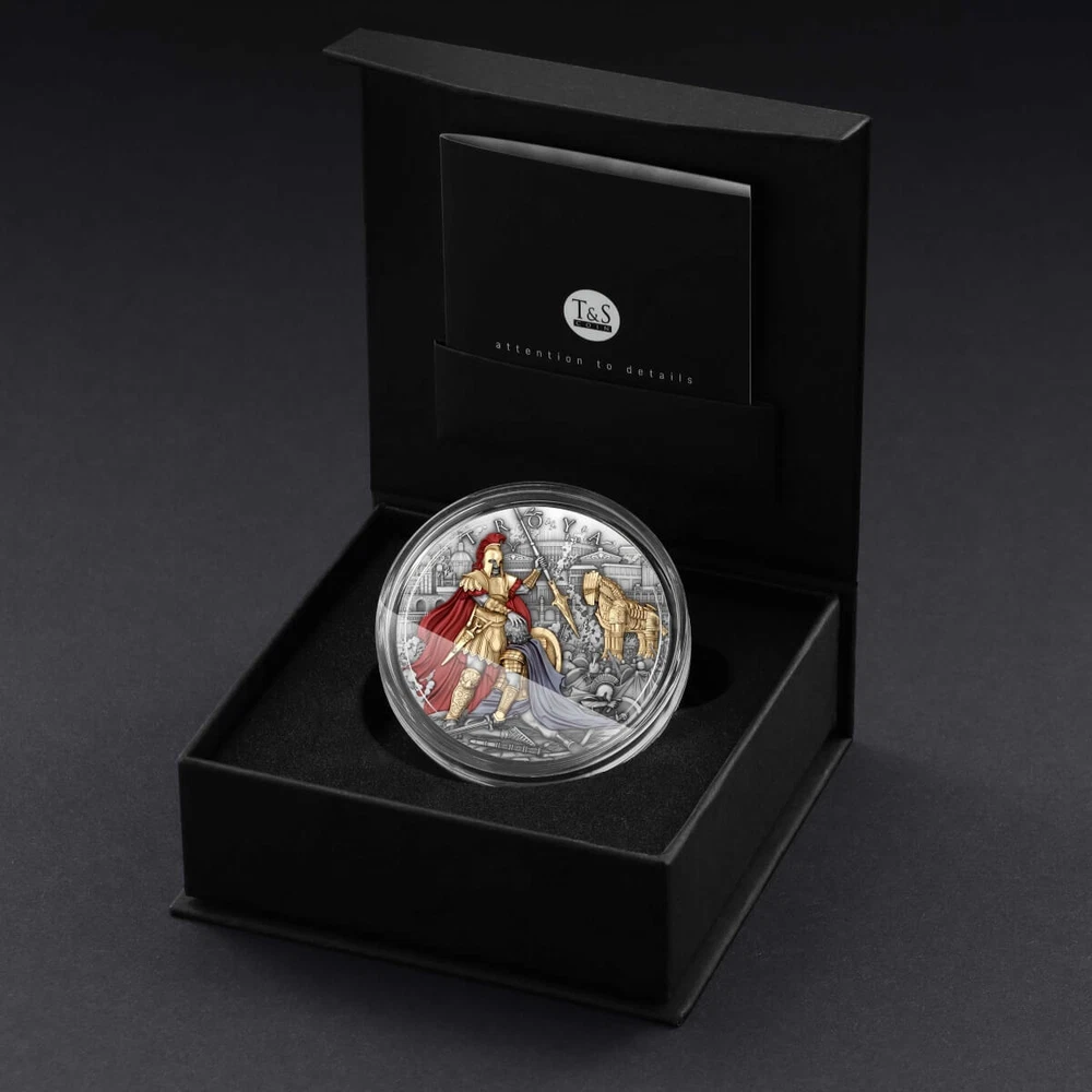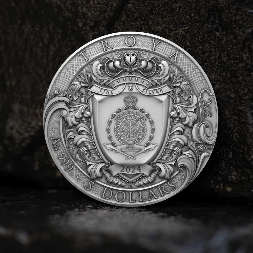 Denomination: $5 Diameter: 45mm Brand: Troya Brand/Mint: T & S Coin Circulated/Uncirculated: Uncirculated Strike Type: Antiqued High Relief Seller Notes: “Uncirculated” Composition: Silver Total Precious Metal Content: 2 oz Modified Item: No Year: 2024 Mintage: 500 Country/Region: Niue Precious Metal Content per Unit: 2 oz Certification: Mint Certified Grade: Ungraded Coin: Troya 2 oz Silver Antiqued Gilded High Relief Coin Fineness: 0.999 Shape: Round Packaging: Display Box