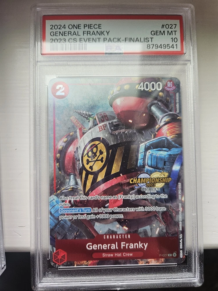 This rare and highly sought-after collectible card game card features the beloved character FRANKY from the popular One Piece CCG. The card number 2024 is part of the Event Pack set and is a final piece in the series, making it a must-have for any serious collector. With only 52 cards in existence, this PSA 10 card is a true gem and will be a valuable addition to any collection. The card is in English and suitable for ages 10 and up. Don't miss out on the opportunity to own this highly coveted piece of One Piece CCG history.