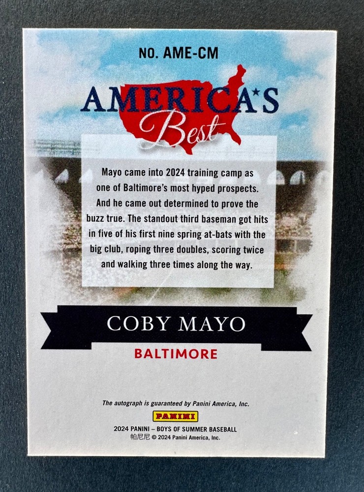 Elevate your collection with the 2024 Panini Boys of Summer Coby Mayo card, featuring the promising talent from the Baltimore Orioles. This exclusive card is part of the America's Best Signatures insert set, showcasing Mayo's autograph against a sleek holographic background. With its limited print run of just 149, it's a must-have for fans and collectors alike. This sports trading card is not only a rookie card but also comes with a sticker, adding to its uniqueness. Serial numbered and sporting the prestigious 'America’s Best Auto' parallel/variety, this card captures the essence of a rising star in Major League Baseball. Add this Panini gem to your collection and own a piece of baseball history.