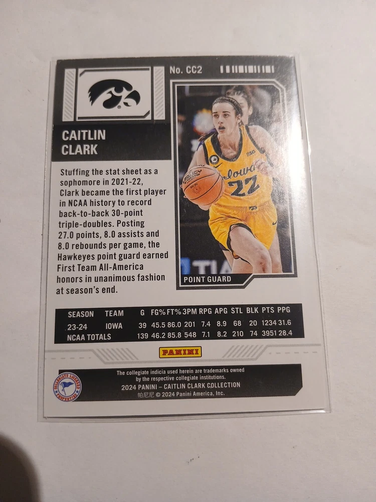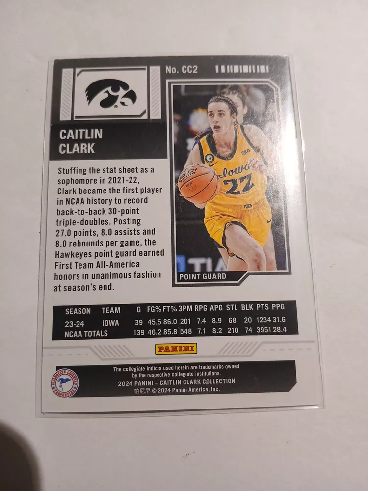 This 2024 Panini Caitlin Clark Collection sports trading card features the rookie and insert set, College Contenders, with card number CC2. The card showcases the basketball player, Caitlin Clark, who is part of the National Collegiate Athletic Association (NCAA) league. The card is manufactured by Panini and is a great addition to any sports trading card collection. The season for this card is 2024 and it falls under the category of Sports Mem, Cards & Fan Shop and Trading Card Singles.