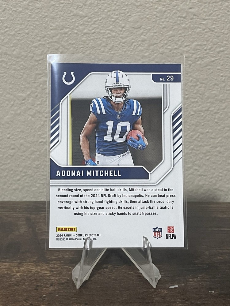 The product is a 2024 Panini Donruss Elite Series Rookies trading card featuring Adonai Mitchell, a rookie player for the Indianapolis Colts in the National Football League (NFL). This card, numbered 29 in the set, is part of the Elite Series Rookies insert set, showcasing promising newcomers in the sport of football. As a base parallel variety, this sports trading card manufactured by Panini is a sought-after collectible for fans and collectors alike.
