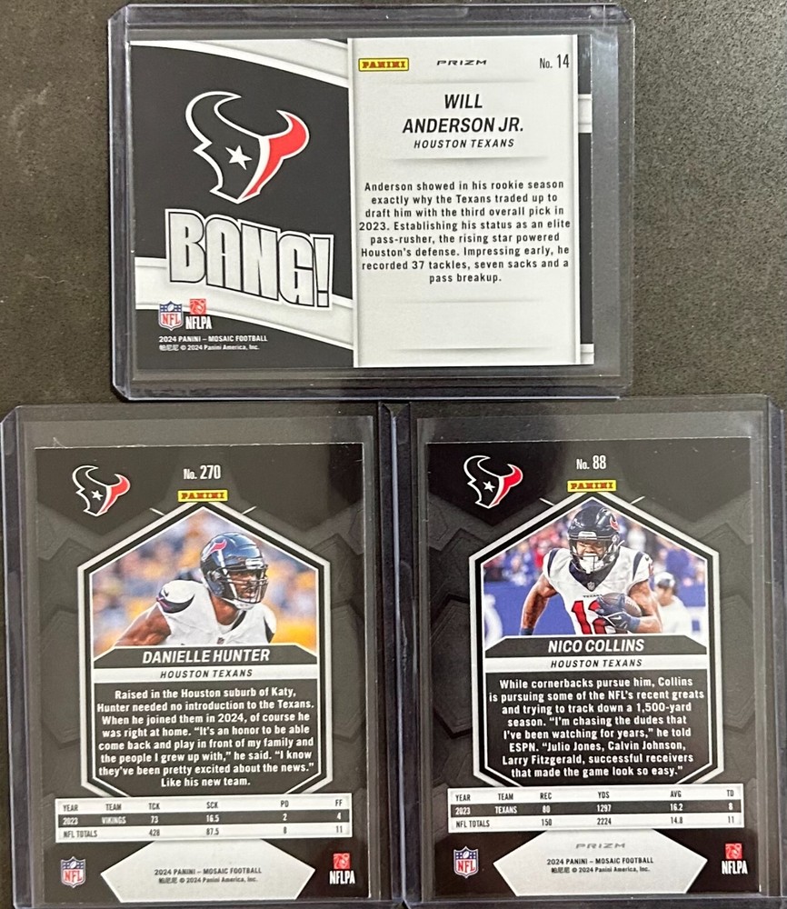 2024 Panini Mosaic Football 3 card insert/parallel trading lot for the Houston Texans! The cards are: 2024 Mosaic Nico Collins #88 Reactive Blue 2024 Mosaic Will Anderson Jr. #14 Silver Mosaic BANG! 2024 Mosaic Danielle Hunter #270 National Pride
