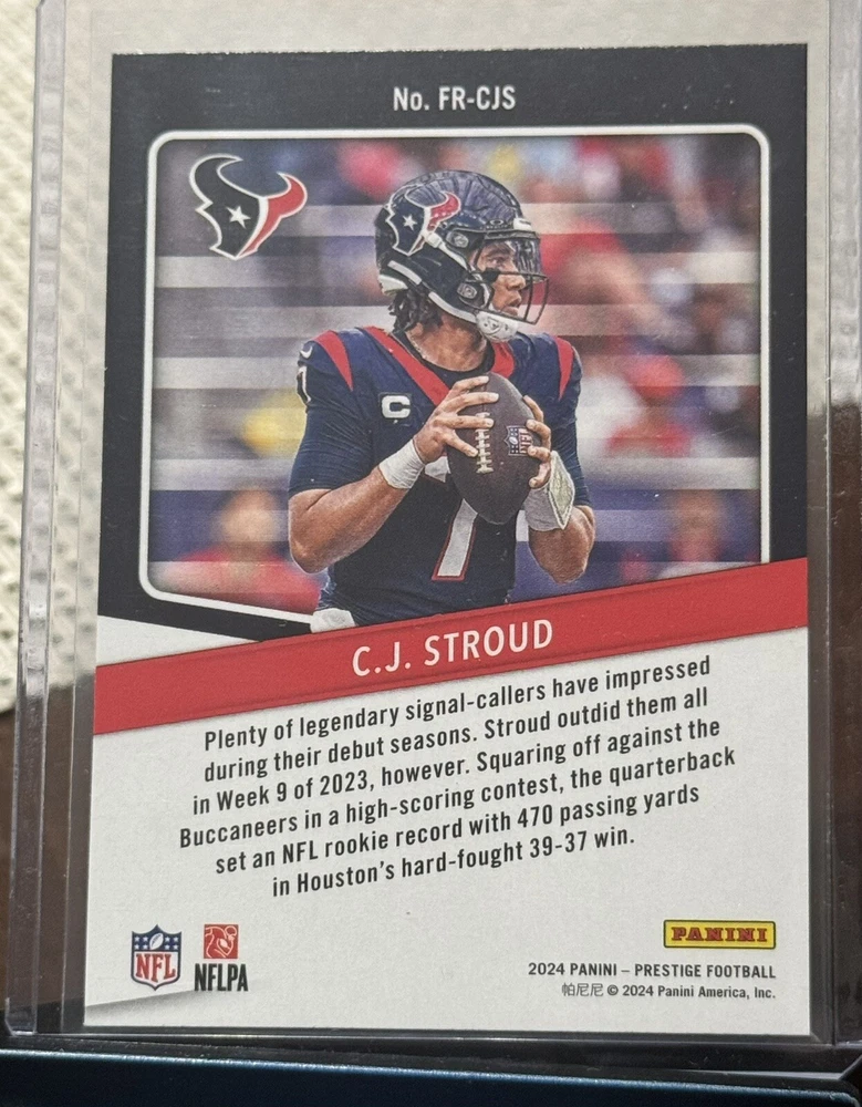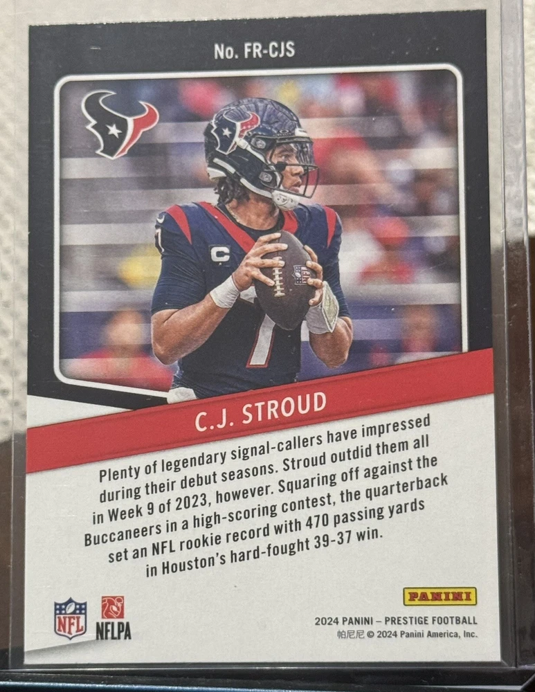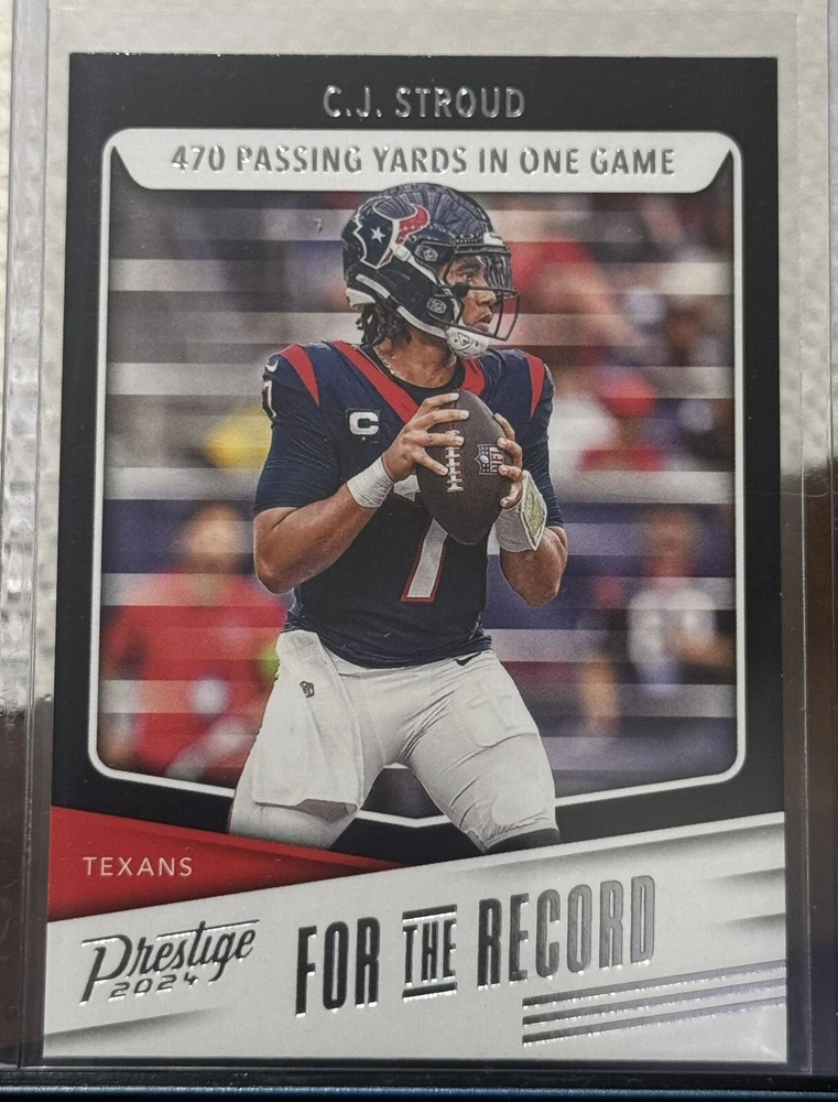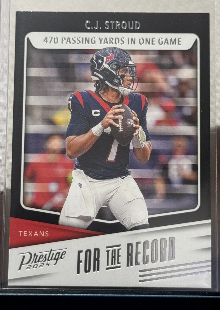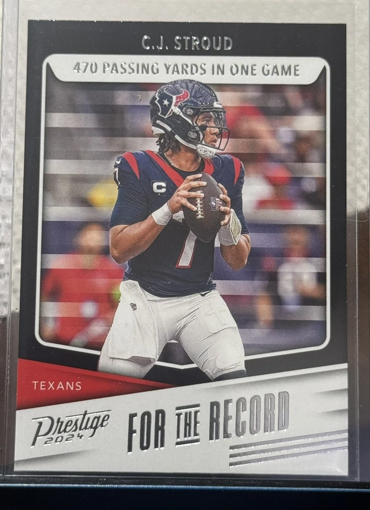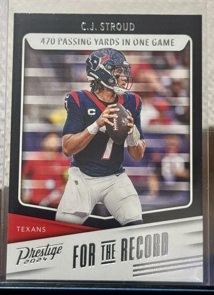 This 2024 Panini Prestige trading card features C.J. Stroud of the Houston Texans, with the card number FR-CJS. It is an insert card from the For The Record set, and is perfect for any National Football League (NFL) football fan. The card is manufactured by Panini and is a sports trading card type. The card is in excellent shape, with a card number of 4000 and a manufacturer code of 4000. It is a great addition to any sports trading card collection and is sure to impress. Don't miss out on the opportunity to own this fantastic card.