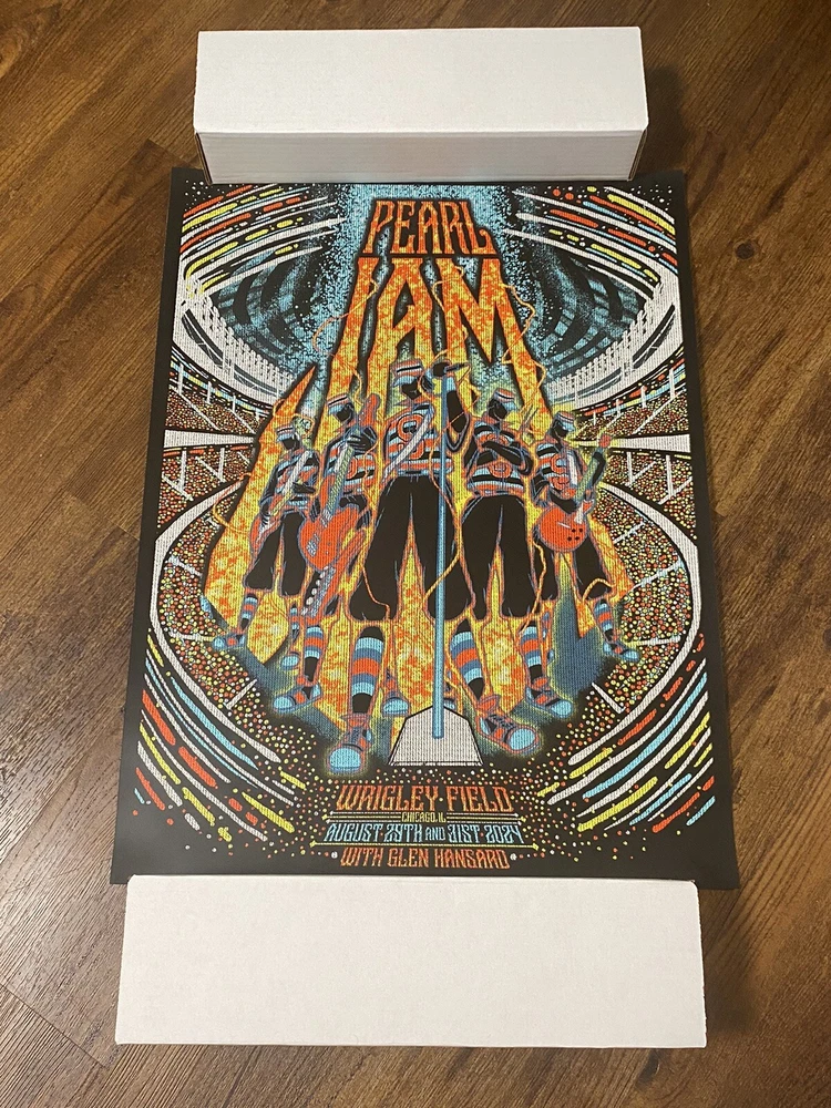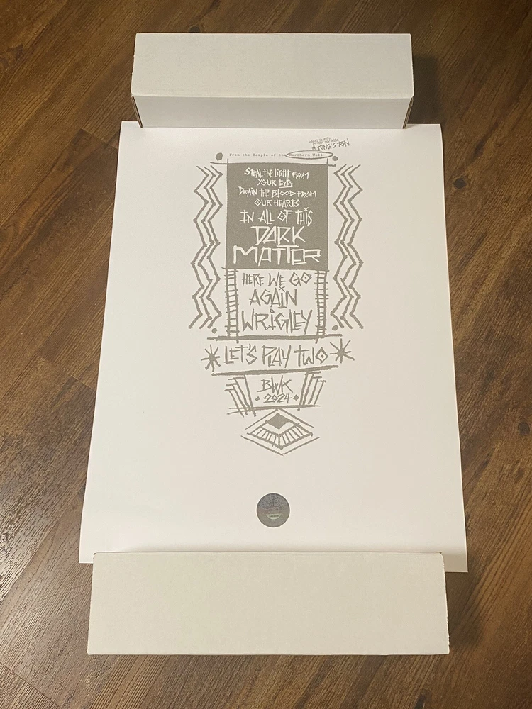 This is a rare and unique opportunity to own a piece of music history. The 2024 Pearl Jam Dark Matter Tour poster, featuring Brad Klausen, is a must-have for any true fan of the band. This original and authentic poster was manufactured in the United States and is a perfect addition to any collection of rock & pop music memorabilia. The poster is designed for Wrigley Field in Chicago and features the iconic Pearl Jam logo and dark matter imagery. This piece is perfect for framing and displaying in any home, office, or music fan's collection. Don't miss out on the chance to own a piece of Pearl Jam history with this amazing poster.