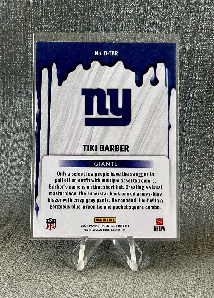 This 2024 Prestige Football Tiki Barber Drip Trading Card is a must-have for any New York Giants fan or sports card collector. It features a short print, insert, and chase design, making it a unique addition to any collection. The card is part of the 2024 Presitge Football set manufactured by Panini and showcases Tiki Barber, a former NFL player and member of the New York Giants' Super Bowl XLII team. The card is not autographed but still holds value for its rarity and unique design. It has a card number of D-TBR and represents the 2024 season. Don't miss out on the chance to add this SSP (Super Short Print) card to your collection.