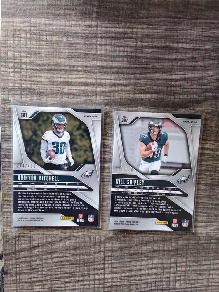 The 2024 Panini Prizm Quinyon Mitchell & Will Shipley Pandora /400 Rookies #397 #381 trading card set features two cards of football players Mitchell and Shipley from the Philadelphia Eagles team. The cards are manufactured on card stock by Panini and are part of the National Football League (NFL) league. These rookie cards are serial numbered, short print, and have a limited edition of 400. The set is in English and was manufactured in the United States in 2024.