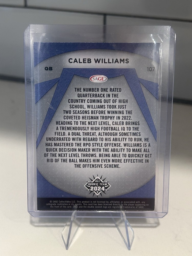 The 2024 SAGE Low Series trading card features Caleb Williams, a member of the All Rookie Team, represented by card number 107. This card is in near mint or better condition, making it a valuable addition to any sports trading card collection.
