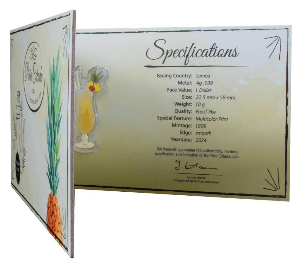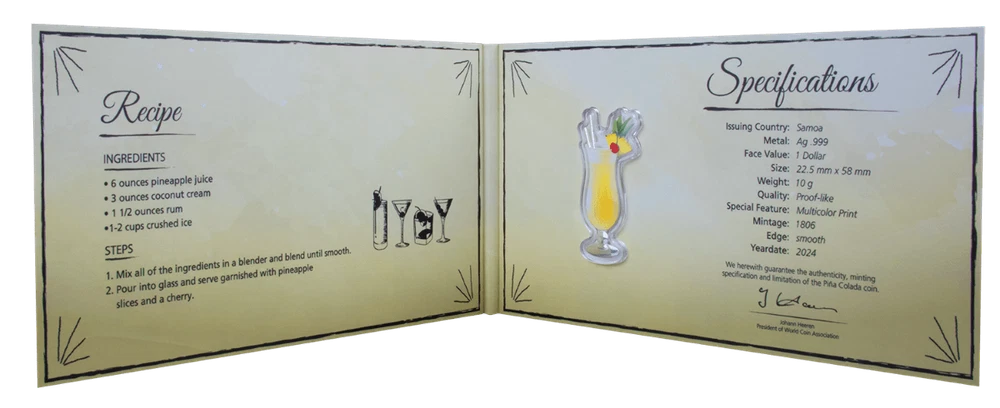 FREE SHIPPING ON DOMESTIC ORDERS New releases Deals Exclusives Bullion Gold Graded Licensed Standing behind our products & our name for over a century SINCE 1915 SHOP BY CATEGORY Animal Theme Art Coins Coin Sets Comics, Notes, & Foils Deals Famous Figures & Landmarks Gold Coins GR Reserve Exclusives Graded Coins Holiday Theme Licensed Products Lunar Calendar Nature Coins Premium Bullion Rare Certificate Numbers Shaped Coins Warriors & Gods Other PARTNERS & AFFILIATIONS STORE NEWSLETTER Add us to your Favorites and receive exclusive emails about new items and special promotions! Sign up 2024 Samoa Sip of Art Pina Colada 10g Silver Colorized Shaped Coin Product Description 10 G PINA COLADA COCKTAIL COIN A SIP OF ART ▶ Raise your glass to the second issue of the series: Crafted in the shape of a cocktail glass , this coin features fine details and multi-colour application on only 10 g of Silver. ▶ The coin comes in a beautifully designed blister packaging, perfect for display and includes a classic Piña Colada recipe. ▶ Limited mintage of only 1,806 pieces paying tribute to the year the word “cocktail” was used for the first time. Savour numismatic excellence and secure your quantities now! Contact Shipping Payment Returns To contact our Customer Service Team, simply click the button here and our Customer Service team will be happy to assist. Domestic Shipping Options - Free shipping USPS Ground Advantage UPS Ground Saver International Shipping Options – Calculated USPS Priority Mail International UPS Worldwide Expedited UPS Worldwide Saver UPS Standard to Canada Handling time Will ship within 1 business day of receiving cleared payment. Ship From Location Attleboro, Massachusetts, 02703, United States Note to international buyers The item price and shipping charges do not include import duties, import taxes, and customs clearance fees. These charges are the buyer's responsibility. Please check with your local customs office to determine what these additional charges may be prior to bidding or purchasing an item. If your order is returned to GR Reserve due to your refusal to pay duties or taxes, or if the carrier (for example, Federal Express or UPS) was unable to deliver your order, you agree you are responsible for any return shipping fees, additional duties, or applicable taxes for returning the package back to GR Reserve. In addition, if your package is returned to GR Reserve, we will not reship your order unless and until we are paid in full for any return shipping costs, duties, taxes we have had to pay or advance for you as well as any subsequent re-ship fees back to you. Immediate payment is required upon selecting "Buy It Now" or upon checking out through the cart. We accept payment via U.S. PayPal accounts and all Major Credit Cards, Debit Cards & Google Pay. We are legally required to collect sales tax in those states and localities where we maintain a physical presence. The applicable amount of sales tax charged to an order will be calculated based on the shipment destination's state and local sales tax laws. Thank you for shopping with us on eBay! Standard Other eBay Mastercard® Earn up to 5x points when you use your eBay Mastercard®. Learn more GR Reserve’s return, refund, and exchange policy is limited to (30) business days from the date that you received your item. If you find you have received a defective item, please contact us, and include detailed photos. GR Reserve will then assess whether the product is eligible for a return, refund, or exchange. For approved exchanges, you must follow all instructions provided by us, including packaging the product appropriately. We are responsible for the cost of return domestic shipping and the risk of loss during the return shipment. Refer to eBay Return policy for more details. You are covered by the eBay Money Back Guarantee if you receive an item that is not as described in the listing. Free Shipping On all domestic order 100% SATISFACTION GUARANTEED About Feedback GR Reserve - Attleboro, MA 02703
