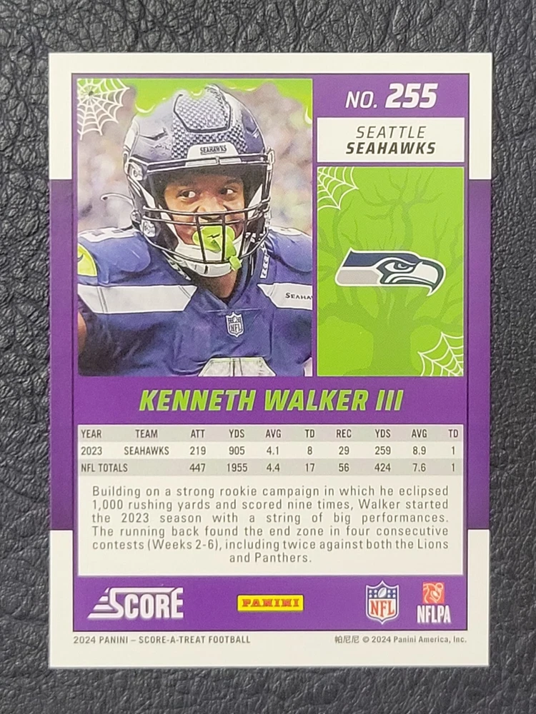This lot includes five Seattle Seahawks trading cards from the 2024 Score set. The cards feature players DK Metcalf, Smith Njigba, Kenneth Walker III, Noah Fant, and Warren Moon. The set includes both base cards and parallel cards, and is perfect for any fan of the National Football League (NFL). These cards are in standard size and manufactured by Panini in the United States. The set is a great addition to any sports trading card collection and celebrates the team's Super Bowl victory.