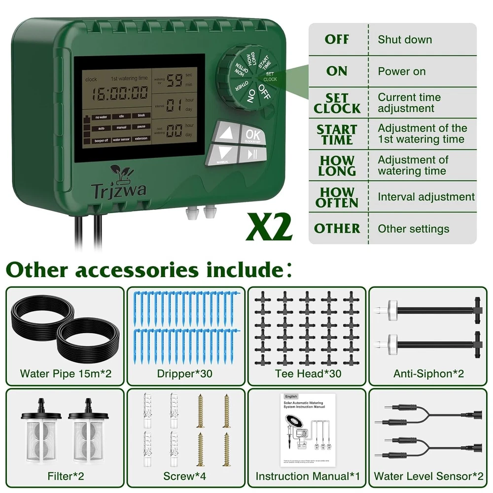 2024 Solar Irrigation System with Automated Water Timer - 2 Pack for 15 Plants ‹ › ‹ › ‹ › ‹ › ‹ › ‹ › ‹ › ‹ › ‹ › ‹ › ‹ › 2024 Solar Irrigation System with Automated Water Timer - 2 Pack for 15 Plants Transform your gardening experience with this innovative Solar Irrigation System, designed to cater to the watering needs of your plants effortlessly. Ideal for various applications including lawns, gardens, flower pots, and greenhouses, this advanced system ensures optimal irrigation that conserves water and embraces the power of sunlight. Features: Split Solar Irrigation Design: This system includes a solar panel and an intelligent irrigation timer with a generous 3-meter cable that enhances solar absorption and provides versatility in your watering range. Precision Irrigation Control: Tailor the watering schedule based on individual plant needs, allowing durations from seconds to 60 minutes, and intervals ranging from 1 hour to 7 days. Intelligent Display: Equipped with features like rain delay, manual and auto mode, and water level detection, ensuring your plants receive the perfect amount of water without overwatering. User-Friendly Operation: The system easily adapts to both indoor and outdoor settings, with user-friendly LED display and intuitive controls that simplify the setup process. Hassle-Free DIY Installation: With all necessary components included, you can assemble the system in just 15 minutes, making it suitable for everyone—from novices to seasoned gardeners. Benefits: Environmentally friendly, utilizing solar energy to irrigate your plants. Customizable irrigation settings optimize water usage effectively. Self-monitoring features ensure timely alerts for low water levels and maintenance needs. Enhance the health and growth of your plants with precise and automated watering. Enjoy more free time as the system automatically takes care of your irrigation needs. Why choose our Solar Irrigation System? Elevate your gardening with our expertly designed Solar Irrigation System, making plant care a breeze while actively conserving resources. Its automated features offer peace of mind, enabling you to create a thriving green space effortlessly. Whether you are an avid gardener or just starting out, this system sets a new standard for convenience and efficiency. Don’t let your plants suffer from inconsistent watering—invest in the future of gardening with our Solar Irrigation System and watch your garden flourish like never before! Shipping Free & Fast Shipping - We offer free shipping to most of the USA with a normal delivery time of 3-7 days. However, due to the current situation, additional delivery time (up to 3 weeks) may be required for some items. Alternative Carriers - We may use alternative carriers (e.g. USPS, FedEx, UPS, etc.) to ensure your package arrives safely and on time. Due to the use of multiple carriers, we are unable to provide a tracking number automatically. Handling Time - Orders are processed and shipped within 1-2 business days of receiving cleared payment. Shipping Restrictions - Shipping to Alaska, Hawaii, Puerto Rico, Guam, and other US territories may incur shipping charges or delivery restrictions. Please contact us before ordering, or your order can be refunded/cancelled. State Restrictions - There may be restrictions based on your state of purchase. For example, certain items may not be shipped to California due to state regulations. Contact for Tracking Updates - If you require tracking updates or have any concerns about the delivery of your order, please feel free to contact us, and we will be happy to assist you. Return 30-Day Hassle-Free Returns - We want you to be completely satisfied with your purchase. If you are not, you can return the item within 30 days of receiving it for a full refund or exchange. Easy Return Process - To start a return, simply contact us and we will provide you with a prepaid return shipping label and detailed instructions. Restocking Fee - There are no restocking fees for returns. However, the buyer is responsible for return shipping costs if the return is not due to a seller's error. Refund Processing Time - Refunds will be processed within 5 business days of receiving the returned item in its original condition. Payment We accept all major credit cards, PayPal, and Apple Pay for your convenience. Your payment information is secure and encrypted to ensure a safe and seamless transaction. Please complete your payment within 3 days of purchase to avoid any delays in shipping. Feedback Your feedback is extremely important to us. We strive to provide the best products and customer service possible. If you are satisfied with your purchase, please take a moment to leave us a positive review. If you have any concerns or issues with your order, please contact us before leaving negative feedback. We are committed to resolving any problems and ensuring your satisfaction. Contact Us If you have any questions or concerns, please feel free to reach out to our customer support team. You can contact us through the eBay messaging system. We are available Monday to Friday, 9:00 am to 5:00 pm EST, and we will do our best to respond to your inquiry within 24 hours. Buy it now and enjoy a pleasant shopping experience! UPC: Not Set Set Includes: Hose,Solar Panel,Irrigation Water Timer,Ground Stake,Water Hose,Irrigation Drippers,Tee-Head,Anti-Siphon,Water Level Sensor,Filter,Screw Kits Features: Auto-Off,Rain Delay,Manual & Auto Mode,Water Level Detection,Automatic Alarm,Adjustable Watering Frequency,Adjustable Watering Duration,User-Friendly Operation Smart Home Protocol: Not Applicable/Not Available Smart Home Compatibility: Not Applicable/Not Available Suitable For: Not Set Material: Plastic Type: Drip Irrigation System Brand: Unbranded Number of Zones: 15 Number of Watering Programs: 2 Number of Outlets: 2 Model: Not Set Manufacturer Warranty: Not Set MPN: Not Set Threaded Connection: