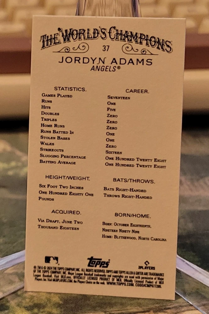 Franchise:BaseballCard Name:2024 Topps Allen & Ginter Black Border Mini Jordyn Adams #37 RCGame:UnspecifiedCard Number:37Manufacturer:Topps Allen & GinterCharacter:Jordyn AdamsSet:Topps Allen & Ginter Black Border MiniSeason:2024Parallel/Variety:Black BorderOriginal/Licensed Reprint:OriginalSport:BaseballType:Sports Trading CardYear Manufactured:2024Vintage:NoPlayer/Athlete:Jordyn AdamsTeam:UnspecifiedCard Size:4" x 2¾"Features:RookieStage:UnspecifiedAutographed:No