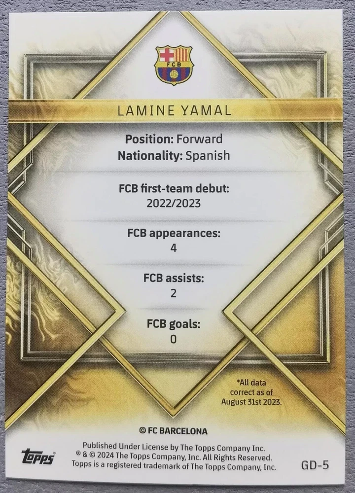 Get your hands on this rare 2024 Topps Barcelona Team Set trading card featuring rookie player Lamine Yamal. This limited Short print edition Pink Parallel variant is numbered out of only 99. A must-have for any soccer card collector, this card showcases a Gold Drip design that sets it apart from the rest. Add this special edition to your collection and watch it increase in value over time.