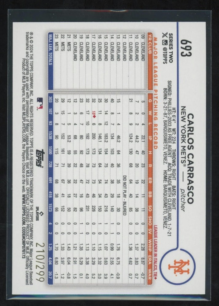 This is a nice example of a 2024 Topps #693 Carlos Carrasco Orange Crackle Foil Other important information about this card: SN In 2024 Carlos Carrasco played for the New York Mets. Please check out our other listings for more great cards.