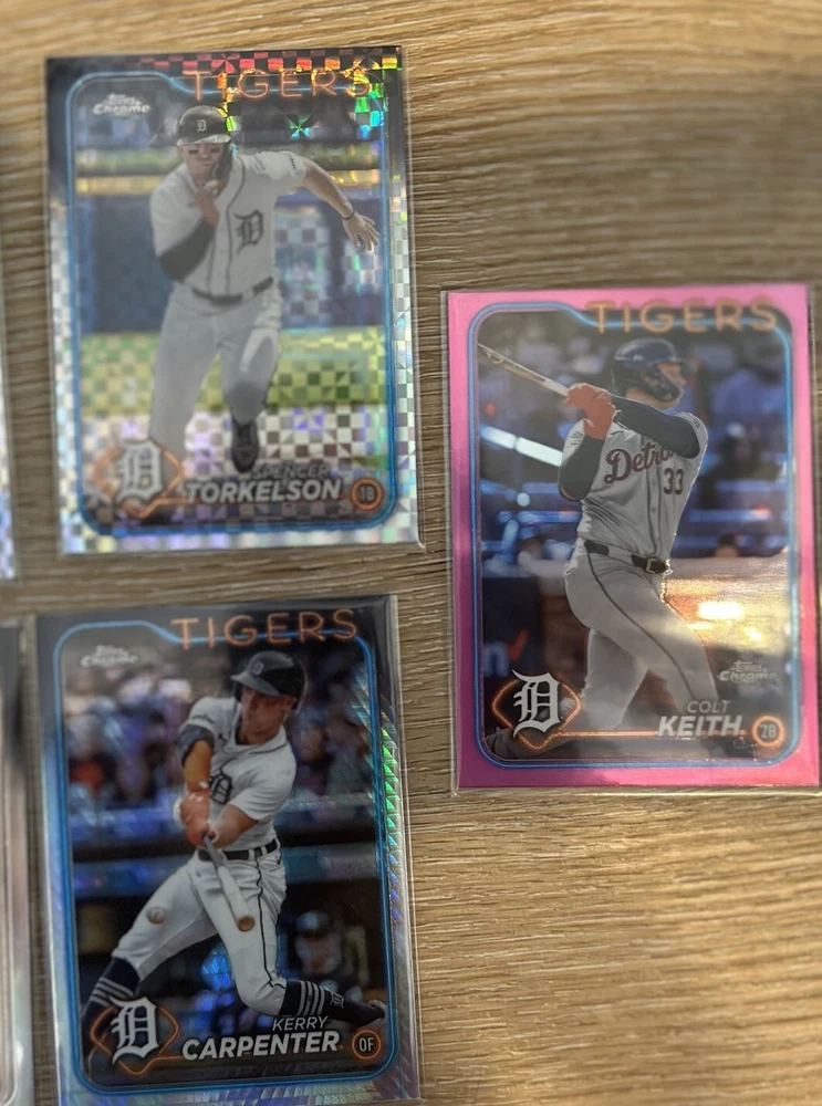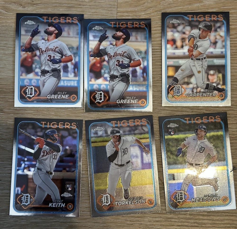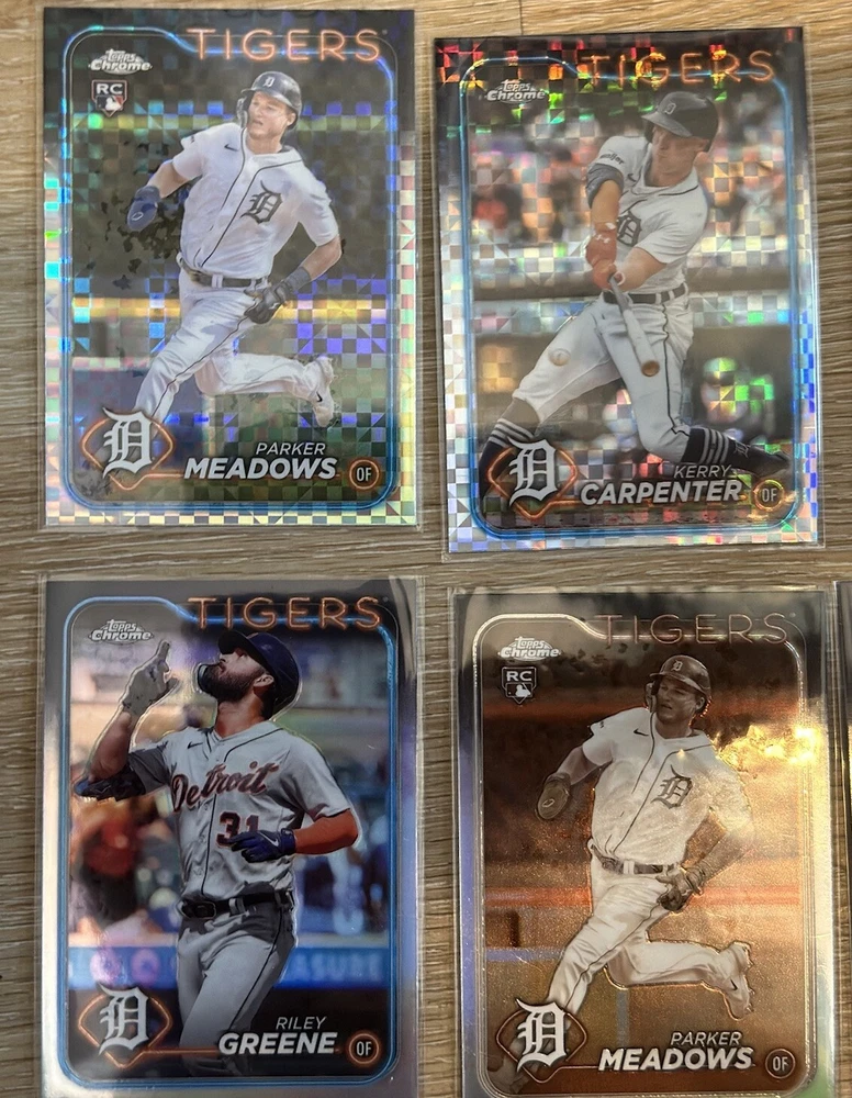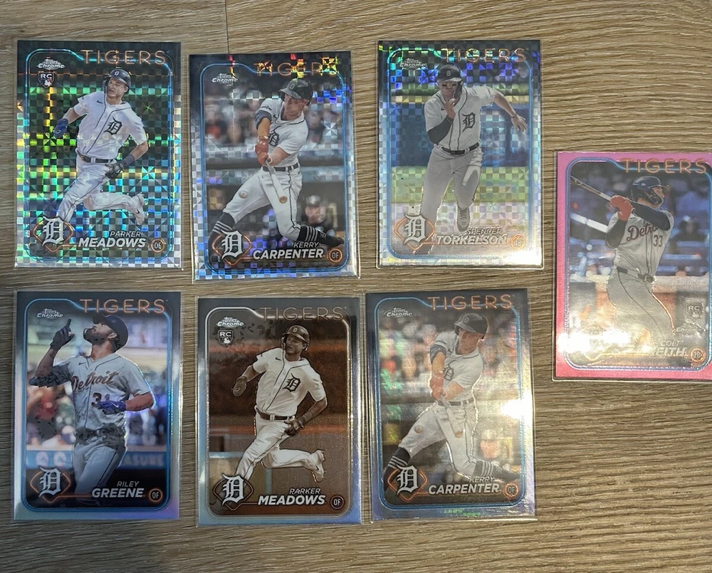 2024 Topps Chrome Detroit Tigers Lot - Base Cards: Spencer Torkelson Parker Meadows Kerry Carpenter Colt Keith 2 - Riley Greene Parallels: Colt Keith - Pink Refractor Spencer Torkelson - XFractor Kerry Carpenter - XFractor, Prism Refractor Parker Meadows - XFractor, Sepia Refractor Riley Greene - Refractor