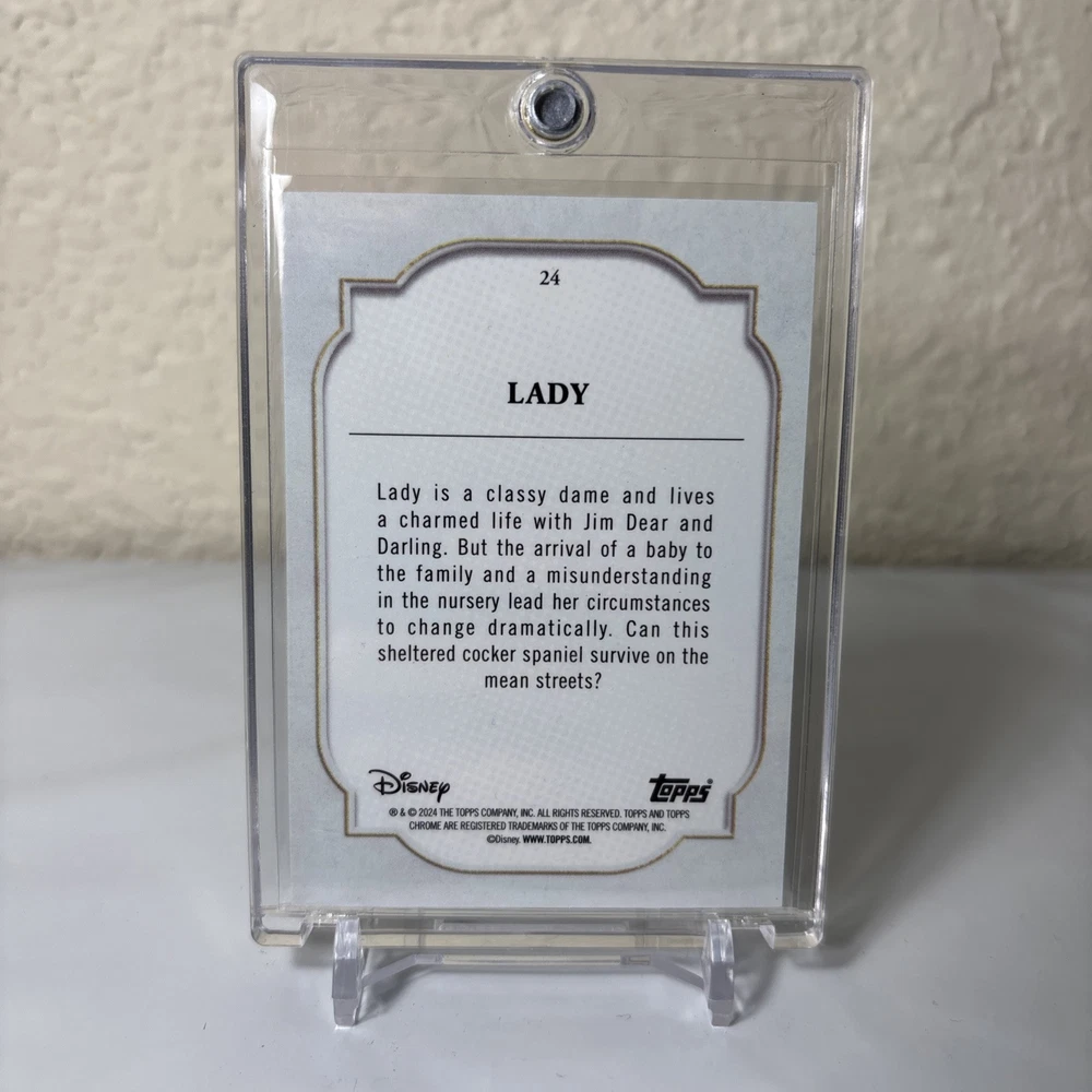 Delve into the enchanting world of Disney with the 2024 Topps Chrome Disney Lady Superfractor card, featuring the iconic duo from Lady and the Tramp. This exclusive collectible, a one-of-a-kind piece, showcases Lady in stunning detail, a true gem for Disney aficionados and trading card enthusiasts alike. Crafted with the renowned quality of Topps, the Superfractor parallel variety adds an extra layer of allure, making it a standout addition to any collection. With no autograph, the card's sleek design and the unique 'One of One' feature ensure its place as a singular masterpiece, capturing the magic of Disney's timeless storytelling.