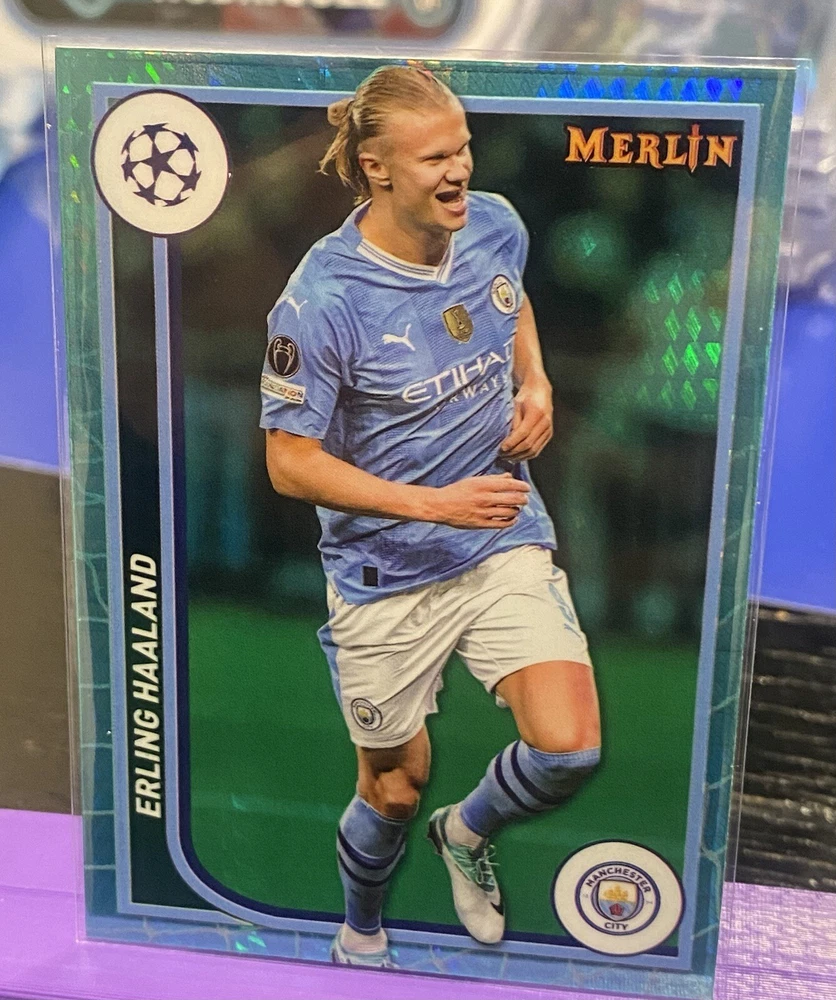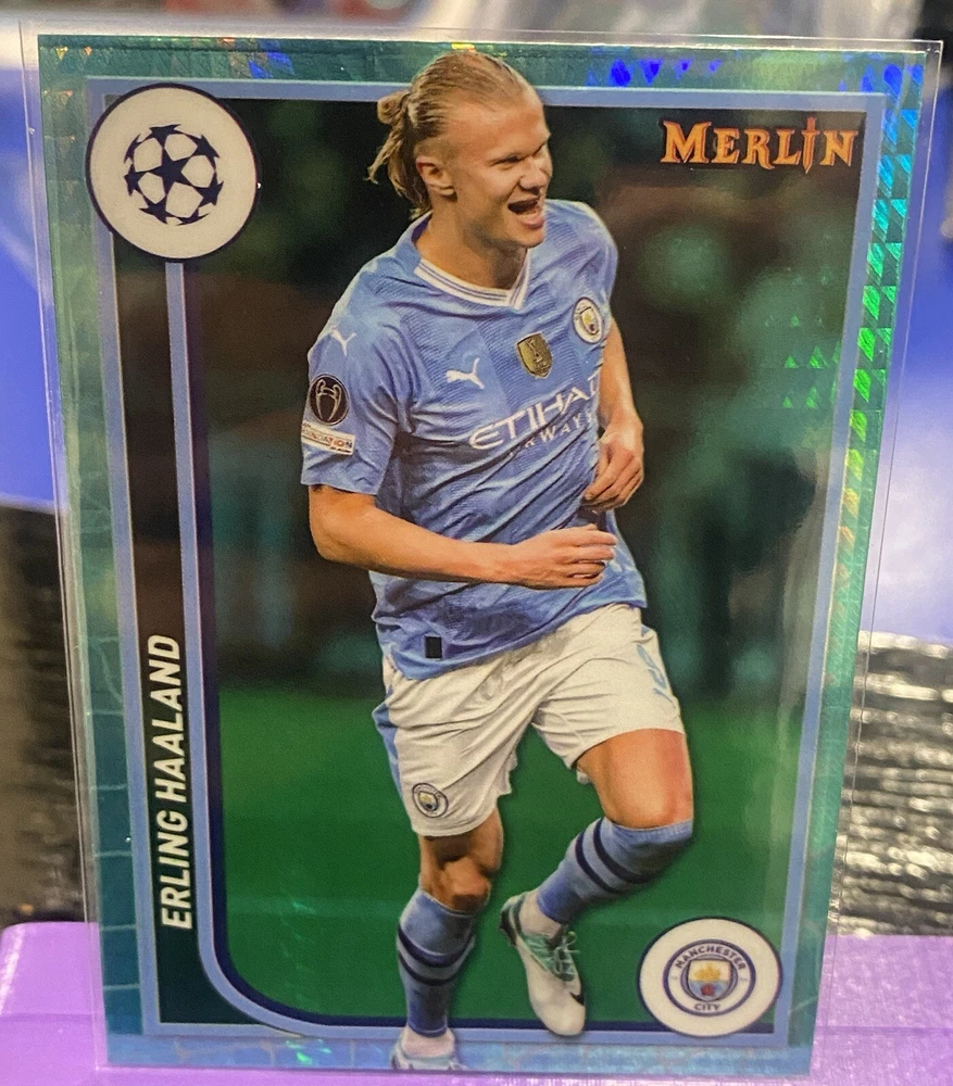 Just ripped from Merlins Gamers box! Get this Aqua Refractor Prism from Topps 2024! Haaland is one of the most dominant footballers in todays game! This card states he became the third player in history to net five times in a single UEFA champions league fixture ! With this purchase some extra random cards will be inserted into your shipment for the spooky season 👻✅🔥