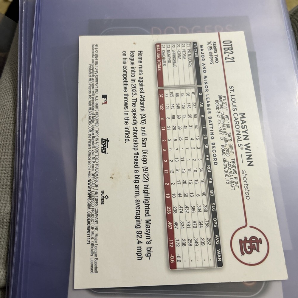 The product is a 2024 Topps Oversized Companions Masyn Winn Rookie Card featuring the player from the St. Louis Cardinals. This oversized trading card is part of Series 2 and does not feature an autograph. The card is in near mint or better condition and is a great addition to any MLB or baseball card collection. Manufactured by Topps, this card is a must-have for fans of Masyn Winn and the St. Louis Cardinals.