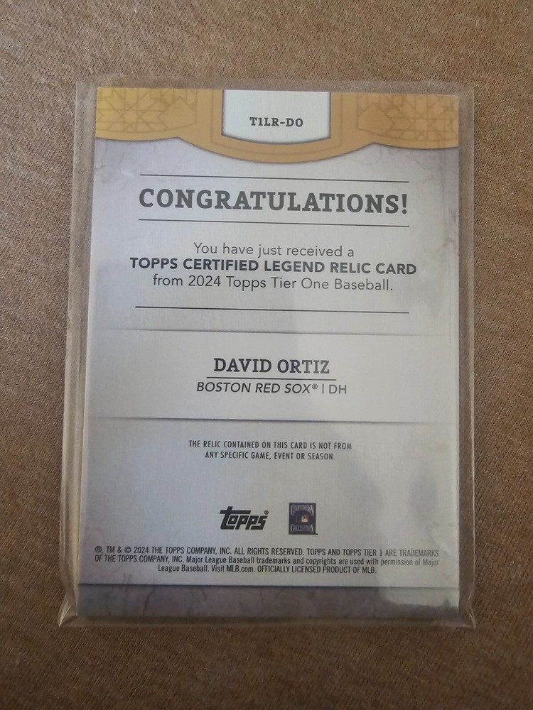 Step up your baseball collection with the 2024 Topps Tier One David Ortiz Game Used Patch Relic card. Limited to just 199 pieces, this highly sought-after memorabilia features a piece of game-worn clothing and a serial number, making it a unique treasure for any fan or collector. Celebrate the legend of David Ortiz with this exquisite card from the Red Sox's fan-favorite series. The Relic parallel adds an extra layer of authenticity and prestige, ensuring this card stands out in any collection. Add a piece of baseball history to your lineup today and own a snapshot of the sport's storied past.