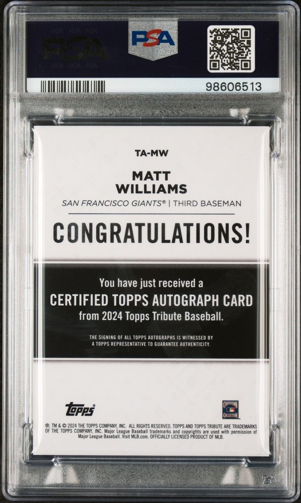 Unveiling the absolute jewel of your sports card collection, the magnificent 2024 Topps Tribute TAMW Matt Williams Autograph-Blue /150 PSA 10 Gem Mint San Francisco Giants! This card is a true baseball enthusiast's dream, a testament to the brilliance of the game and the exceptional talent of Matt Williams. The PSA 10 Gem Mint condition speaks volumes about the impeccable care and preservation of this card. Crafted by the renowned Topps Tribute, this card is not just a piece of cardboard, but a piece of history, a tribute to the legacy of an iconic player. The lustrous blue hue enhances the visual allure of this card, making it a standout piece in any collection. The card number 'TAMW' is a mark of its authenticity, adding that extra layer of exclusivity. With just 150 of these exceptional cards in circulation, owning one is indeed a badge of honor for any serious collector. The autograph of Matt Williams, the star of San Francisco Giants, makes this card an irresistible treasure. This card is a perfect blend of artistic design, high-grade material, and a tangible connection to the sporting world. It's more than just a card; it's a memento of the thrilling world of baseball, a tribute to a legendary player, and a testament to the owner's discerning taste. Add this spectacular 2024 Topps Tribute TAMW Matt Williams Autograph-Blue /150 PSA 10 Gem Mint San Francisco Giants card to your collection today, and let it be the crowning glory of your sports memorabilia!