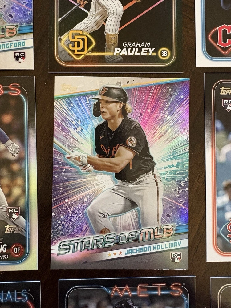 This 2024 Topps Update Series trading card features Pete Crow-Armstrong and Jackson Holliday, two rising stars in baseball. The card is a Rainbow Foil parallel/variety, adding a unique touch to your collection. The card is in excellent shape, with a Near Mint or better grade. It is a great addition to any sports trading card collection, especially those interested in baseball. Don't miss out on the opportunity to own a piece of the 2024 season with this Jackson Holliday Pete Crow-Armstrong Rainbow Foil card.