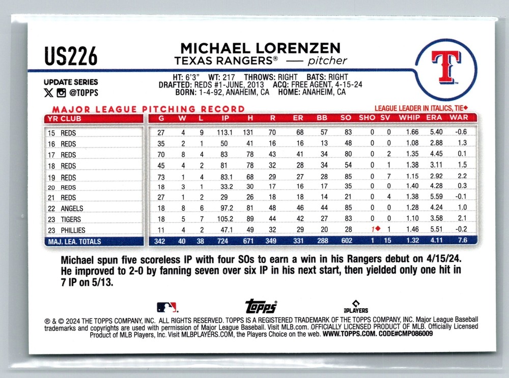 This is a nice example of a 2024 Topps Update #US226 Michael Lorenzen Aqua. Other important information about this card: In 2024 Michael Lorenzen played for the Texas Rangers. Please check out our other listings for more great cards. Lot:23