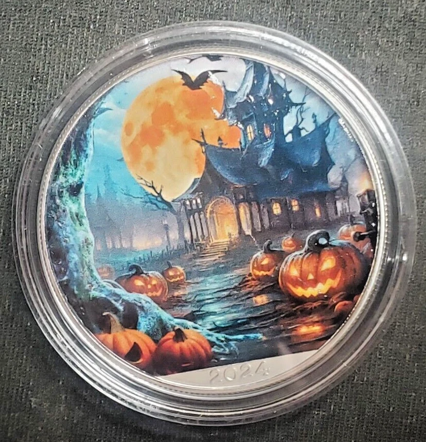 The 2024 U.S. Silver Eagle Halloween Scary House Pumpkins coin is a 1 oz fine silver piece minted by the U.S. Mint with COA. The obverse features a colored design depicting a Scary house and pumpkins for Halloween. This coin has a fineness of 0.999 and is part of the American Eagle series. Great Details!