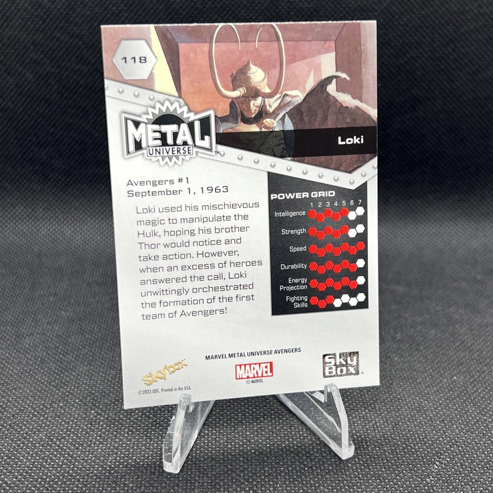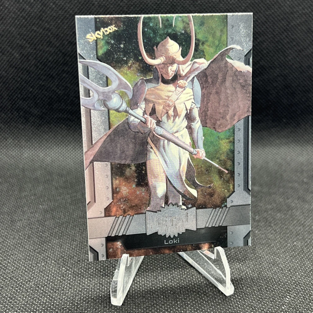 The product is a 2024 Upper Deck Skybox Metal Marvel Avengers trading card featuring the character Loki from the movie "Marvel's The Avengers." This non-sport trading card is part of the High Series set, with a standard card size and made of card stock. It does not come autographed and is in English language. The card is manufactured by SkyBox under the Marvel franchise and Avengers series, suitable for ages 4 and up.