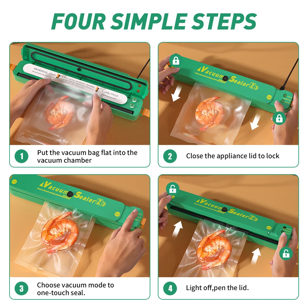 This vacuum sealer is a game-changer for keeping food fresh longer! It’s super easy to use—just load your food, press a button, and watch it quickly remove all the air. The green ABS body feels sturdy, and the included seal bags are a nice bonus. Perfect for meats, veggies, and leftovers—no more spoiled food! Compact yet powerful, it’s a must-have for any kitchen. Love how it locks in freshness and saves me money. Highly recommend!