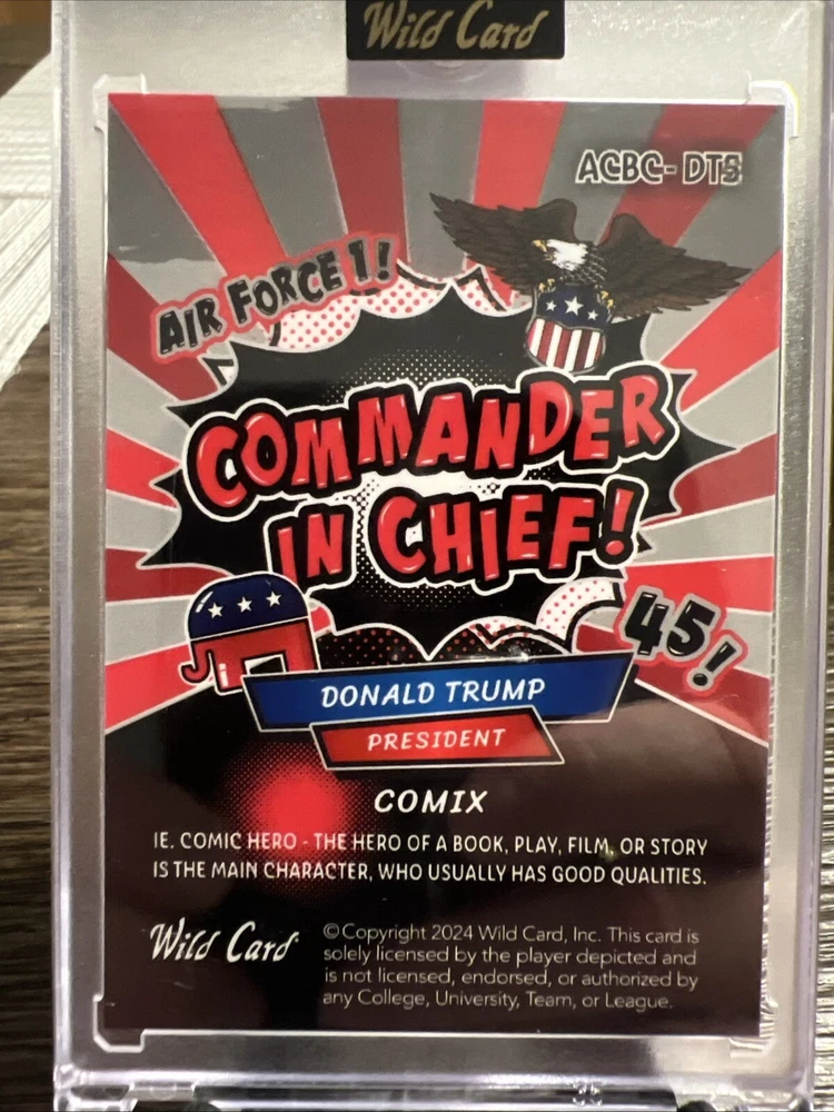 This 2024 Wild Card Alumination Donald Trump Commander In Chief trading card is a must-have for any fan of the former president. With only 10 in existence, this original licensed reprint is a rare find and features a serial number and comix design. The card is in excellent shape, with a Near Mint or Better grade, and is part of the US Presidents franchise. The card showcases President Donald J Trump in his Commander In Chief role and is from the 2024 Wild Card Trump set. It is a non-sport trading card and is not graded or autographed. The card number is CBC-DTS and it was manufactured by Wild Card. This item is perfect for collectors and fans alike.
