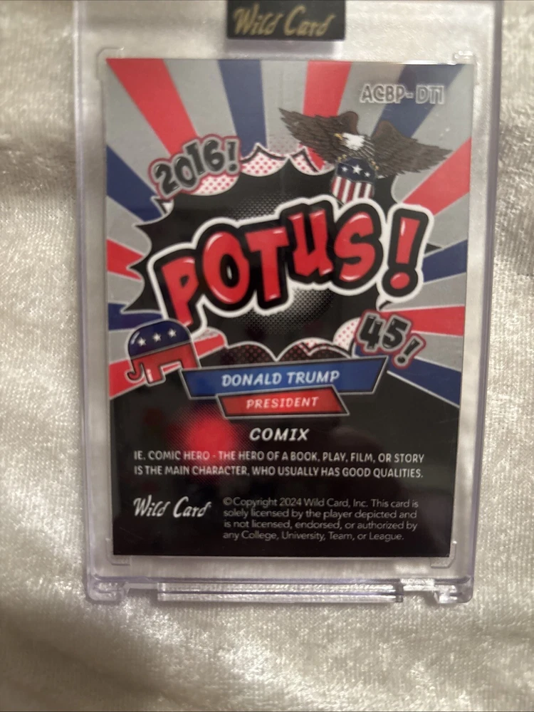 Franchise:AlluminationSigned By:President Donald J TrumpFeatured Person/Artist:Donald Trump, President Donald J TrumpFeatures:ComixType:Non-Sport Trading CardYear Manufactured:2024Vintage:NoOriginal/Licensed Reprint:OriginalCharacter:President Donald J TrumpPrint Run:7Autographed:NoManufacturer:Wild CardSet:Allumination