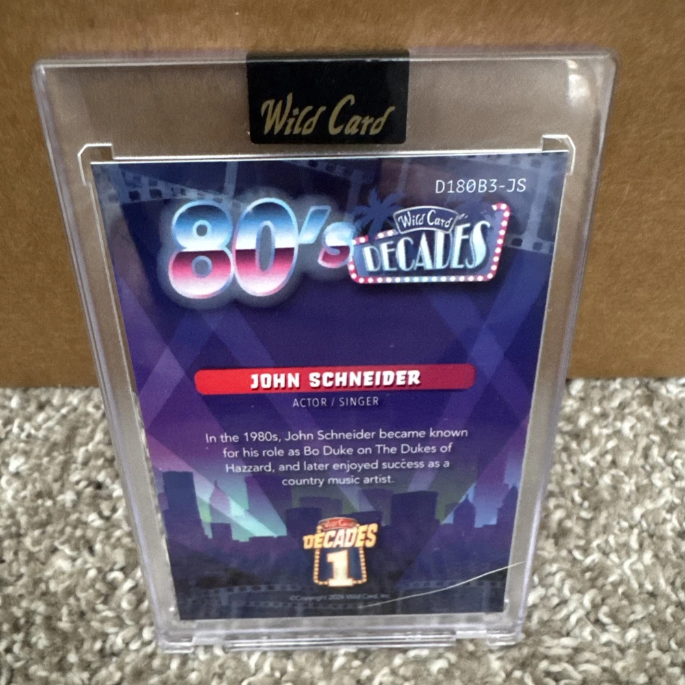 The 2024 Wild Card Decades Miami Vice 80s 1/1 John Schneider trading card features an autograph by John Schneider on card stock material. This non-sport trading card is part of the Film & TV Stars franchise and has a serial number of #D180P5-JS. Manufactured by Wild Card in the United States, it is in near mint or better condition.