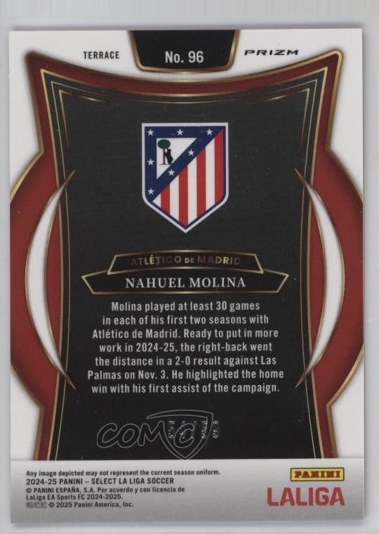 2024-25 Panini Select La Liga - [Base] - Red Wave Prizm #96 Terrace - Nahuel Molina Qty Made: 59 - Soccer Card - Featuring the Atletico Madrid - Featuring Nahuel Molina Search for more: 2024-25 Panini Select La Liga Search for more: 2024-25 Panini Select La Liga - [Base] - Red Wave Prizm View all of our Listings Auctions Buy It Now About Us Located in the beautiful Pacific Northwest, COMC (Check Out My Cards) is the world's largest consignment service for trading card singles. More than 10,000 people have used our consignment service to list over 50 million trading cards. Find out how we can help you consign your items on eBay by contacting us through eBay messaging. COMC -- "The Safe & Easy Way to Buy & Sell" Representative Image - Select Specific Item above to see image of actual item Representative Image - Select Specific Item above to see image of actual item Raw Condition for Modern Cards Unless otherwise noted, raw modern cards are listed in Near Mint-Mint condition or better. A NM-MT card appears to be Mint at first glance, but upon closer inspection, may exhibit some of the following: minor print defects (e.g. roller marks, print line, dimple), minor scratches, slight edge wear, and slight corner wear. Centering is clearly visible in the images provided and does not factor into our condition assessment. Raw Condition for Vintage Cards Unless otherwise noted, raw vintage cards are listed in Excellent condition or better. An EX card may exhibit some of the following: minor rounding of corners, surface wear, print defects, light scratches, and slight edge wear/chipping. Centering is clearly visible in the images provided and does not factor into our condition assessment. Domestic Shipping Combined shipping for multiple items is available. To receive combined shipping, please ensure all desired items are in your eBay shopping cart before proceeding to checkout. eBay limits orders to 40 items per order. We automatically combine multiple orders placed on the same day. If you place multiple orders on the same day, please contact us to request a refund of applicable shipping costs. Signature confirmation may be required on invoices over $400. All cards are protected and shipped securely. International Shipping COMC offers eBay's International Shipping (EIS) for international orders under $2,500* (see country exceptions below). All duties and import fees are paid at checkout; in the rare event that there are additional import fees upon delivery, these are borne by the buyer. EIS packages route through a shipping hub in Erlanger, KY before shipping to their final destination. Please note that EIS does not allow for combined shipments. The shipping rates are determined by eBay and cannot be adjusted. *Maximum sale price exceptions: Colombia, Kuwait ($2,000); Taiwan ($1,539); Chile, Costa Rica, Guatemala, Honduras, Trinidad and Tobago ($1,000); Antigua and Barbuda, Aruba, Belize, Dominica, Grenada, Philippines, Saint Kitts and Nevis, Saint Lucia, Montserrat, Turks and Caicos Islands ($500); Dominican Republic, El Salvador ($200). Please request a shipping quote through eBay messaging for orders that exceed the maximum sale price supported by eBay's International Shipping. You will be responsible for all duties and import fees for international orders shipped outside the EIS. All cards are protected and shipped securely. Payment COMC does not accept offers on our cards through our eBay storefront. COMC utilizes eBay’s managed payments system. If you are experiencing difficulties making a payment, please contact eBay for assistance. Return Policy Returns are only accepted on the rare occasion the item is not as described. If you are making a return, please initiate the return process through eBay so a mailing label can be provided for you. Prior to listing, our expert team carefully assessed this item to represent it accurately. Please review the description and high-definition images prior to purchasing to ensure this item meets your satisfaction. We welcome you to contact us if you have further questions about this item. Trust and Integrity COMC carefully assesses each item consigned to us to prevent fraudulent items from entering the marketplace. If you believe an item offered on COMC may be fraudulent, please contact us with details so we can investigate the issue. Items we determine are outside our supported items policy may be removed. Last Modified: 11/20/2025 9:49:40 PM PDT